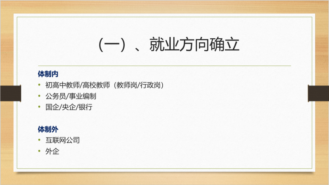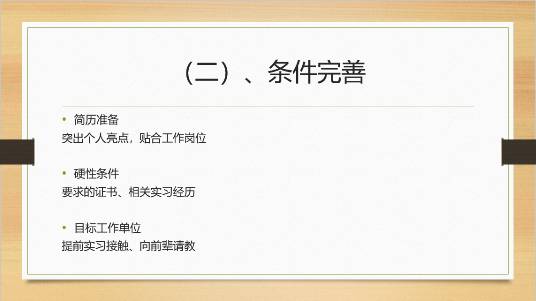 胡艺桐学姐的分享围绕就业前期准备就业期两部分展开。在前期准备阶段,大家需要确立自己的就业方向并完善自己的相关条件,如准备简历、考证、实习、寻找目标单位等。