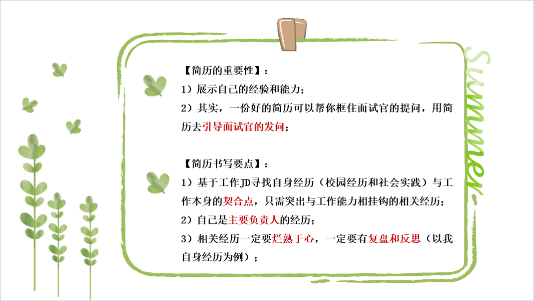 而到了就业期(大三下/研二下),大家就可以开始投递简历、准备笔面试了。学姐建议,大家可以多投简历,但要根据岗位要求对简历做出相应的修改,避免给HR留下海投的印象。