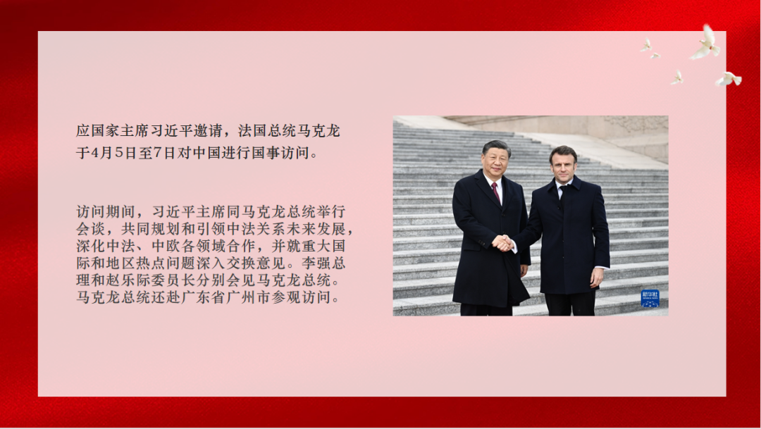 4月6日至7日,法国总统马克龙对中国进行国事访问。这是中国对外交流全面重启、全国“两会”成功召开后的一次重要外交活动,习近平主席和马克龙总统共同擘画两国关系未来,在国际问题和全球治理等世界各国共同关心的问题上达成广泛共识。