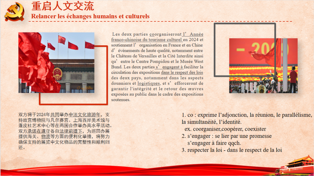 本次法语主题党日分享的内容中,陈洁同学对于中法联合声明中重启人文交流的内容分享给我留下了深刻印象:为了在全球推动保护和促进文化表现形式多样性,中法两国支持深化文化作品创作与利用方面的合作,积极推动重启文化和旅游领域的交流合作。除了对中法两国的国际关系有了更进一步的了解之外,我还学习到了许多相关法语词汇的表达,收获颇丰。