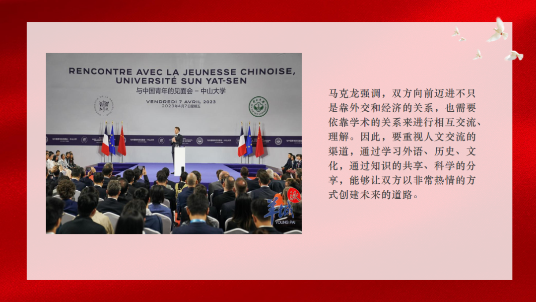 本次马克龙访华期间,两国达成一系列战略共识,双方签署近40项政府间协议和商务合同,共同发表中法联合声明,为两国合作开辟新前景,为中欧关系寻求新动能。主要在三个方面取得成果:一是双方高层交往和战略对话、二是促进经济交流取得重要进展、三是重启两国人文交流。长达三年的疫情终于到了尾声,国内外的各项交流活动也都活跃地进行着,我相信后续中法两国将会缔结更多互利互惠的合作关系。