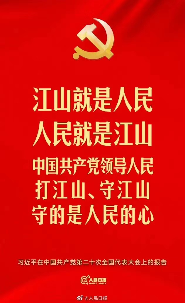 江山就是人民,人民就是江山。中国共产党百年来以百姓为心,与人民同呼吸、共命运、心连心。历史证明了我们党是为人民而生,因人民而兴,始终同人民在一起,为了人民利益而奋斗。习近平总书记在二十大报告中指出,我们要实现好、维护好、发展好最广大人民根本利益,紧紧抓住人民最关心最直接最现实的利益问题。在新征程上,始终坚持人民至上、仅仅依靠人民、不断造福人民,那么我们的百年大党就一定可以带领亿万中国人民创造新的时代辉煌。