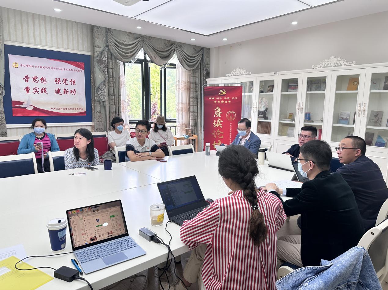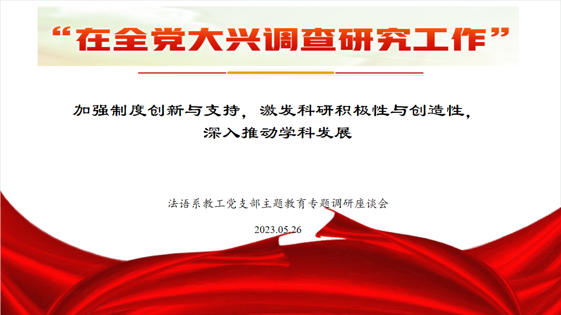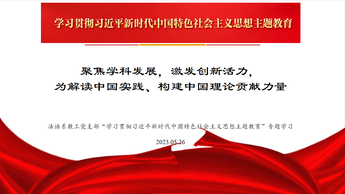 为深入开展学习贯彻习近平新时代中国特色社会主义思想主题教育,法语系教工党支部于5月26日在松江校区3242会议室举行主题党日活动,开展集中研学和专题调研。会前,教工支部精心设计,召开支委会确定学习主题为“聚焦学科发展,激发创新活力,为解读中国实践、构建中国理论贡献力量”;从《习近平新时代中国特色社会主义思想专题摘编》、《习近平著作选读》等主题教育必读书目中选取相关内容,组织党员读原著学原文悟原理,开展自学并撰写个人学习心得。