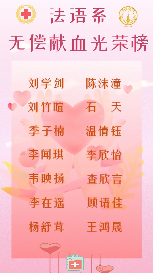 无偿献血是无私奉献、救死扶伤的崇高行为,是我国血液事业发展的总方向。在本学期献血活动中,法语系学子积极参与,为我国血库的有效供给尽一份最大力量。每一位无偿献血者,都值得我们尊敬。 希望法语系学子们在未来依然能踊跃参与无偿献血,为我国人民生命安全和国家血液供应保障体系贡献力量!