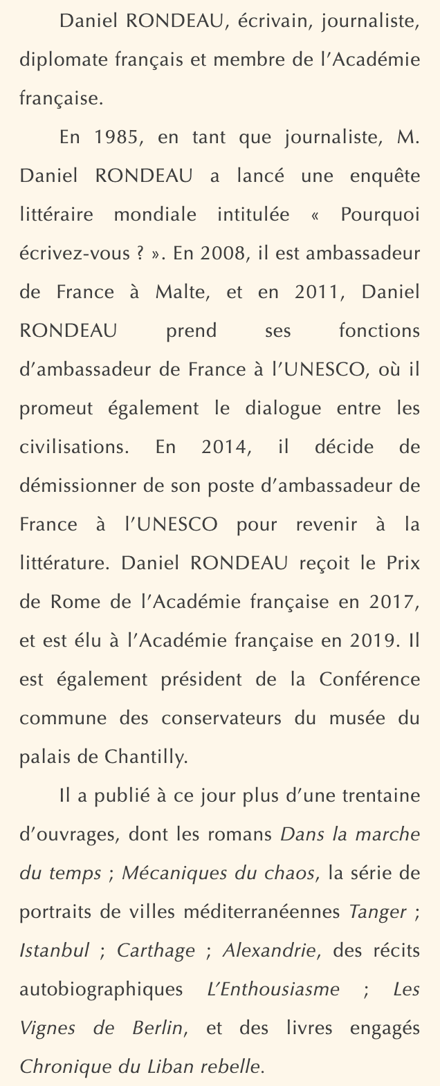 达尼埃尔·洪多(Daniel RONDEAU),法国作家、记者、外交家,法兰西学术院院士。 1985年,作为记者的丹尼尔·洪多发起了一项全球范围的文学调查“你为什么写作?”,轰动全球。2008年,他曾任法国驻马耳他大使。2011年,达尼埃尔·洪多先生就任法国驻联合国教科文组织大使,在任期间组织推动了众多促进不同文明对话交流的活动。2014年,他决定辞去大使一职重返书斋。2017年,达尼埃尔·洪多获得法兰西学术院罗马大奖,并于2019年6月当选为法兰西学术院院士。同时,他也是尚蒂伊宫博物馆馆长联席会议主席。