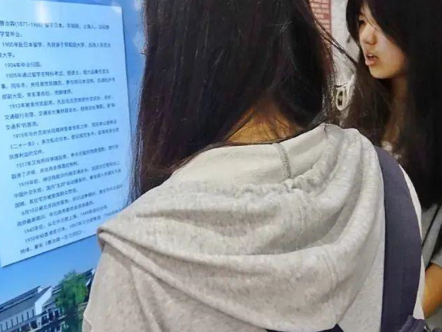 在留学生宗谱展区,入党积极分子们根据宗谱墙上的名单,使用查询系统调阅自己感兴趣的老一辈留学生的资料,并认真浏览展柜中珍藏的近代留学生的物品。
