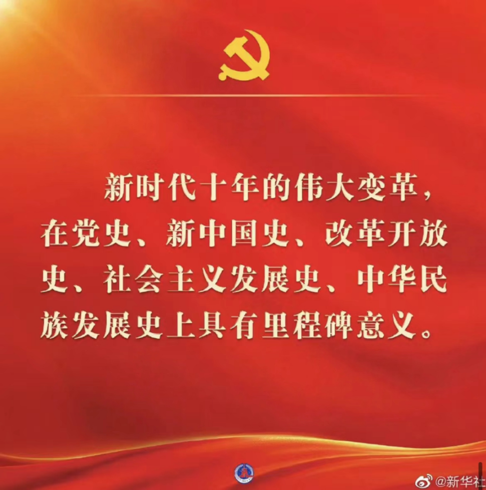 法语:Les grands changements survenus au cours de la décennie de la nouvelle ère sont d'une importance capitale dans l'histoire du Parti, l'histoire de la nouvelle Chine, l'histoire de la réforme et de l'ouverture, l'histoire du développement du socialisme et l'histoire du développement de la nation chinoise.