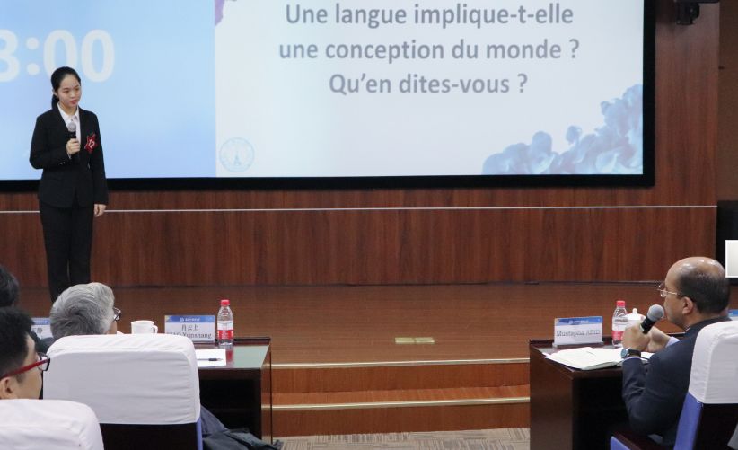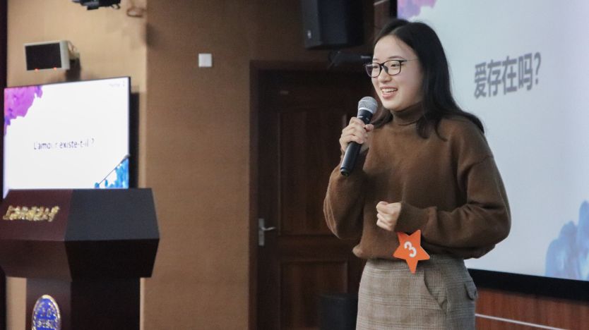 各位参赛选手在决赛前一天抽签决定各自的上场顺序与演讲主题,进行一段一分半至两分钟的演讲。演讲主题中既有对社会热点问题的关注,如“互联网是社会关系的创造者还是破坏者?”,又有深刻的哲学思考,如“美是否是艺术创作的真正目的?”台上的选手们自信大方,用深厚的法语功底表达自我,绽放思想之花。