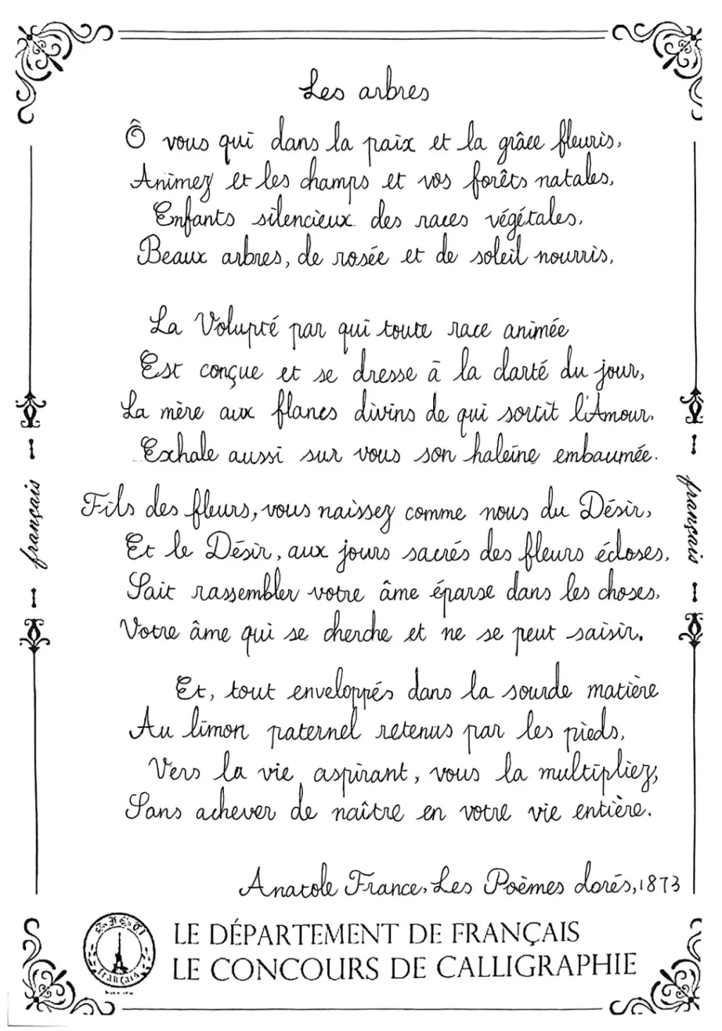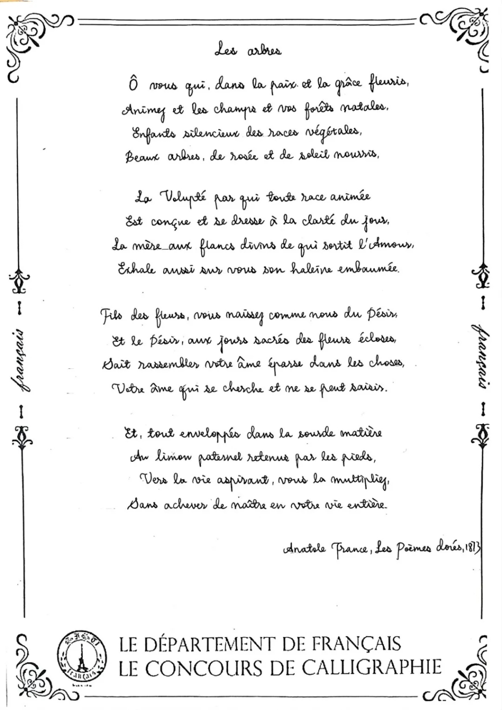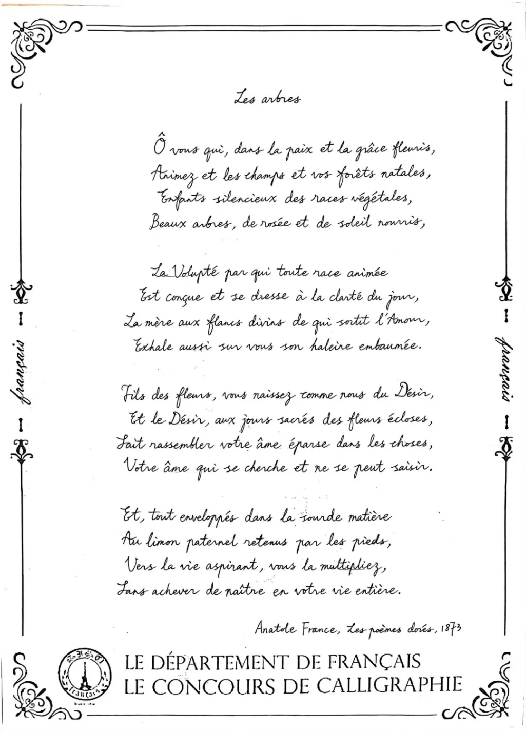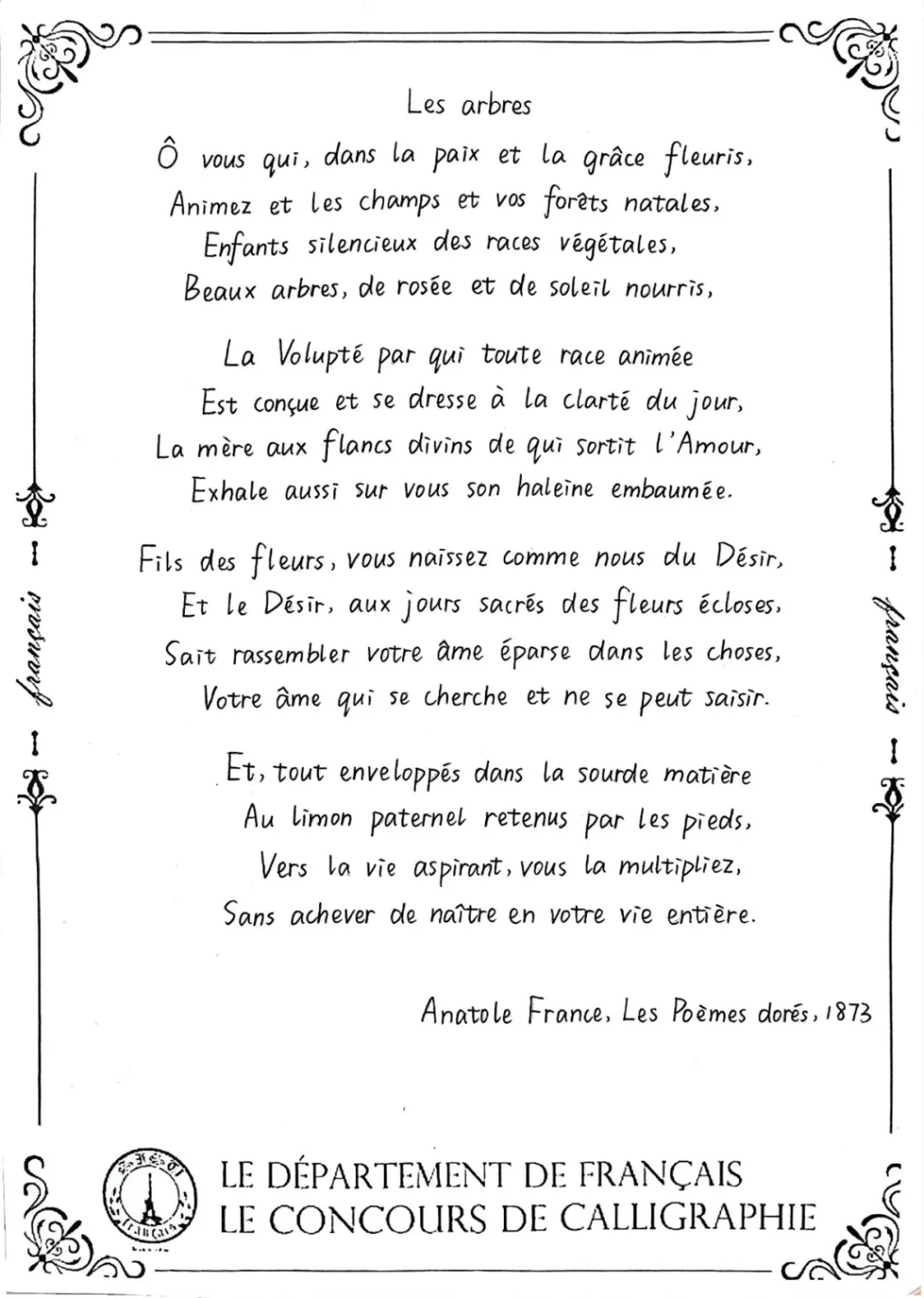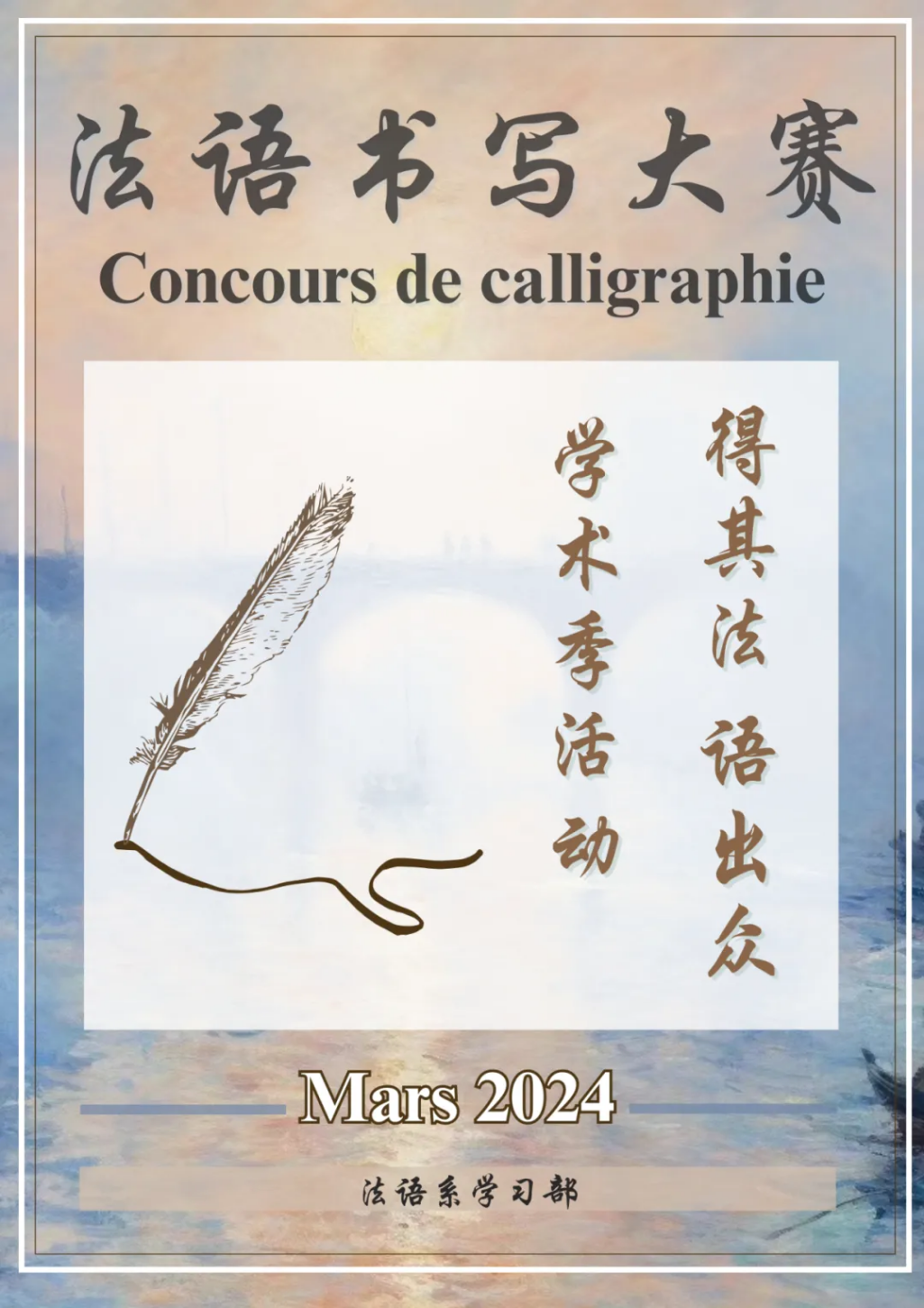 在本次法语书写大赛中,共计收到投稿61份,其中,14幅作品脱颖而出,进入决赛。经过法语系专业教师评审,参考网络投票结果,最终评选出6份获奖作品。