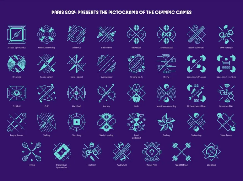2024年巴黎奥运运动项目图标是一次视觉上的盛宴,以大胆而独特的设计风格,将体育项目的精髓和美感展现的淋漓尽致。通过典型的对称版式设计,以及几何图形的巧妙运用,每个图标都成功地捕捉到了相关运动项目的核心元素。