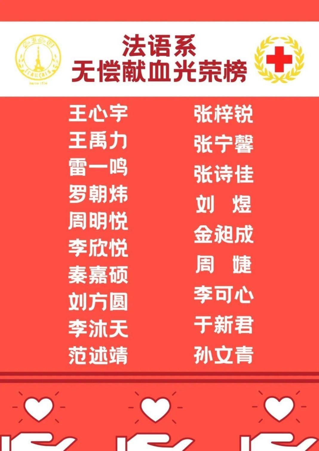 向每一位无偿献血者致敬,希望法语系学子们在未来依然能够更踊跃地参与到此类活动中来,为构筑我国“安全、充足”的血液供应保障体系贡献力量!