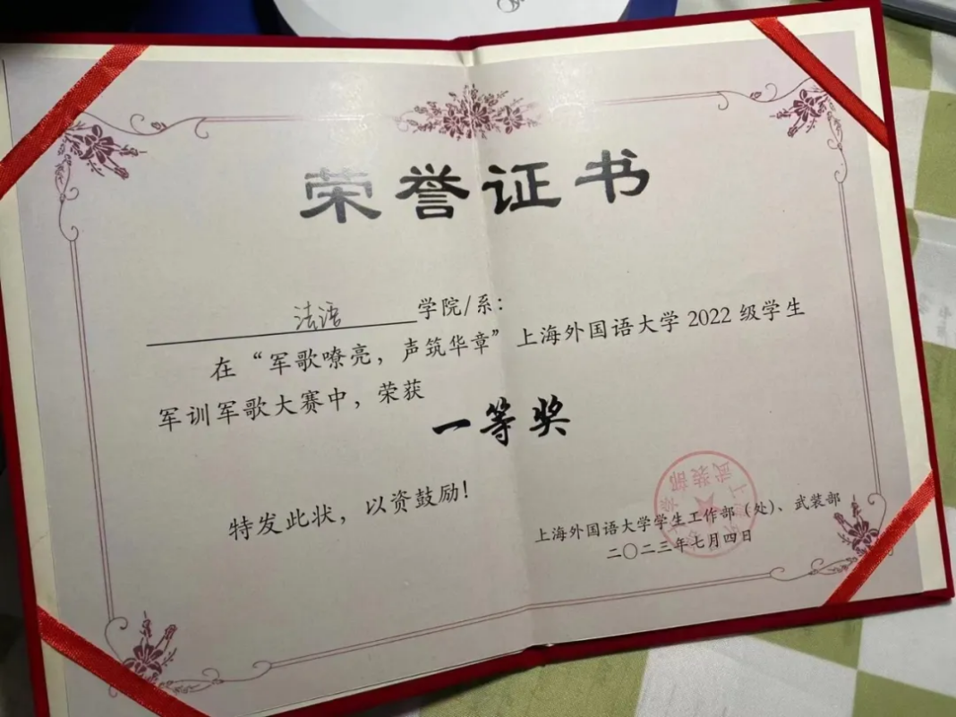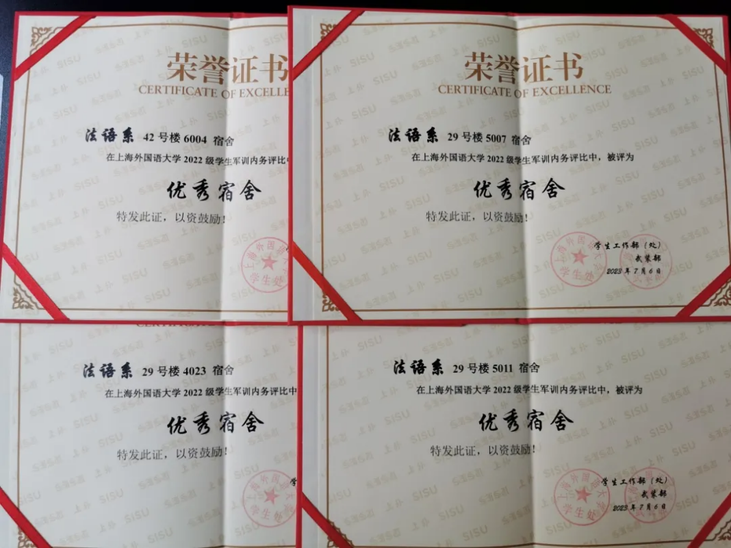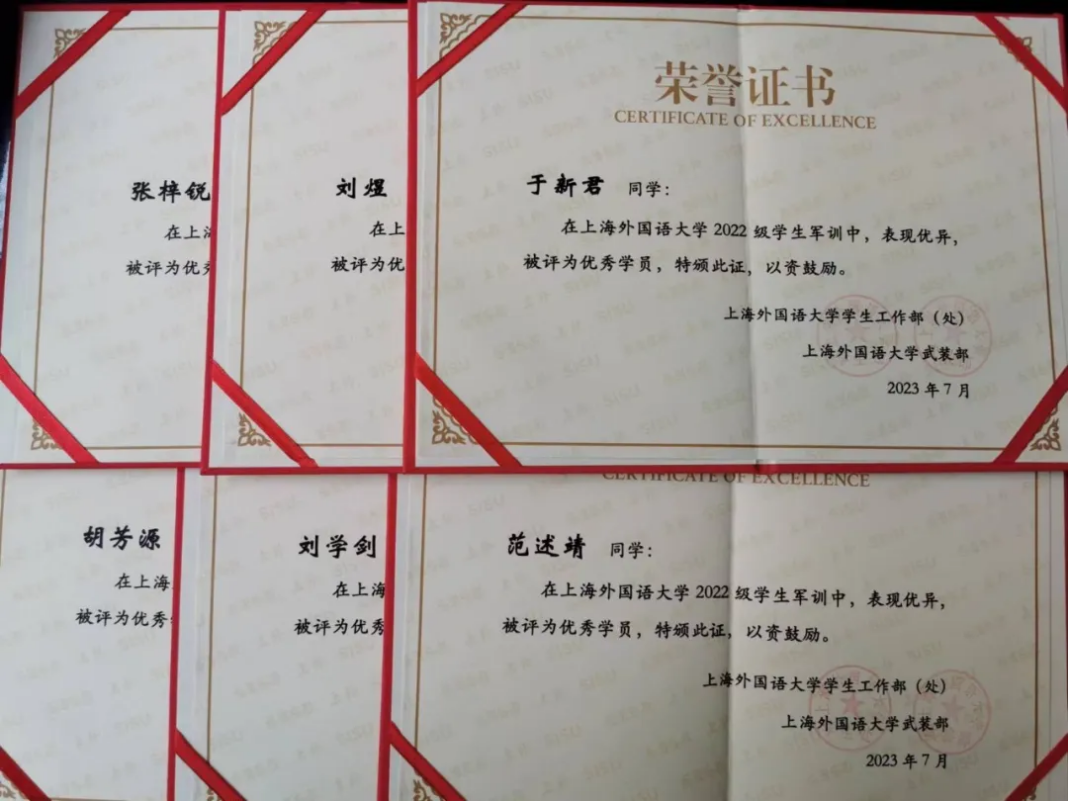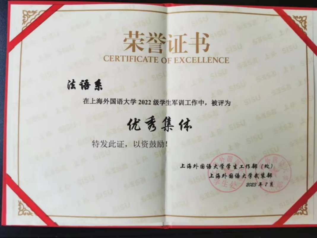 在教官的指导下,在法语系2022级全体同学的努力下,我系张梓锐、于新君、范述靖、刘煜、刘学剑、胡芳源等六位同学获得了优秀学员称号。同时,法语系获得了“优秀集体”奖。这也是对我们军训成果的极大肯定。