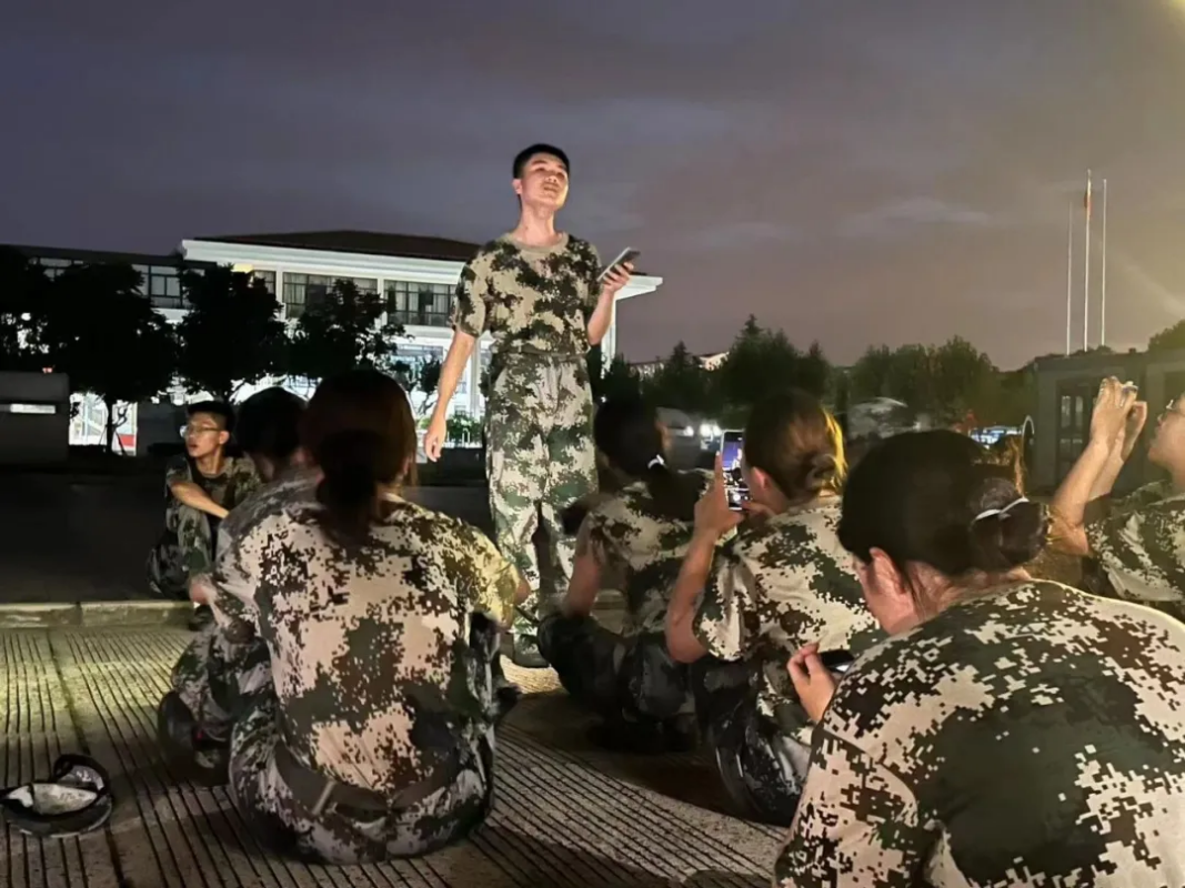 晚上军训休息的间隙,夜幕低垂,同学们纷纷打开手电筒,为唱歌的教官加油。晃动的点点银色灯光,恰似陆地上的繁星点点,和晚风中悠扬的歌声一起,构成了军训生活中忙里偷闲的仲夏夜。