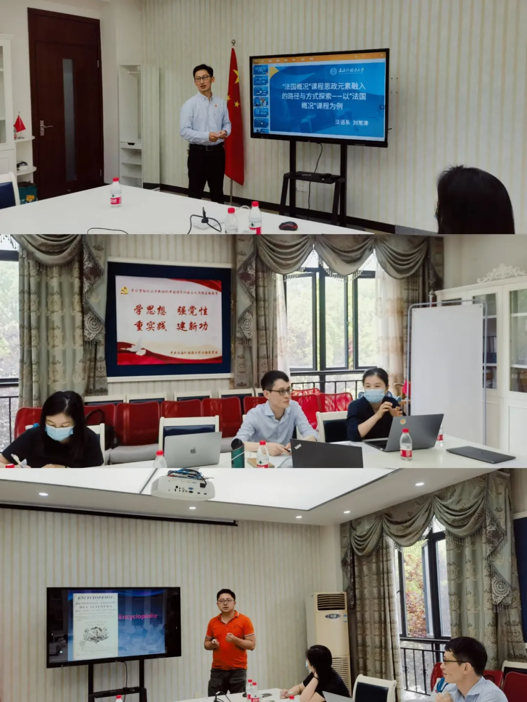 为进一步优化课堂教学,促进教育教学质量的相互提高,提高人才培养质量,形成相互探讨、相互学习的良好氛围,上海外国语大学法语系于2023年6月7日12:00—14:00在松江校区3242会议室组织开展了“法语系课程思政教学研讨会”,法语系系主任王海洲、法语系党委书记忻炯俊莅临参加了本次会议。