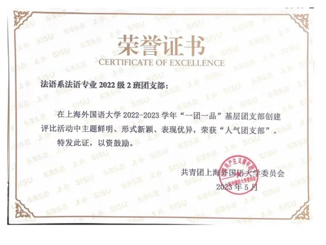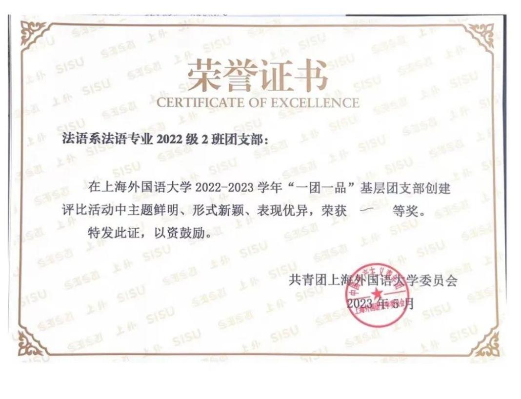 法语系2022级本科生2班团支部荣获上海外国语大学2022-2023学年“一团一品”基层团支部建设评比活动一等奖。