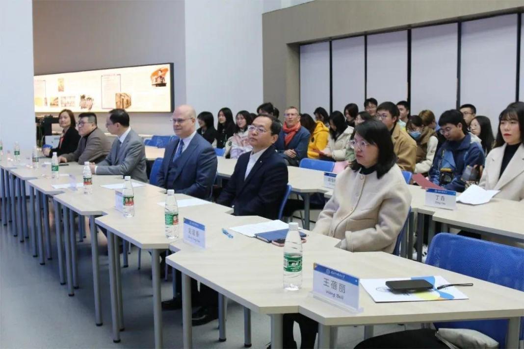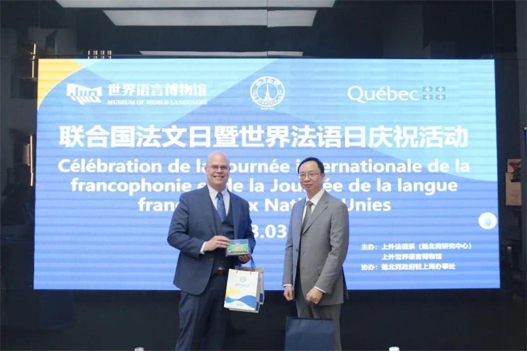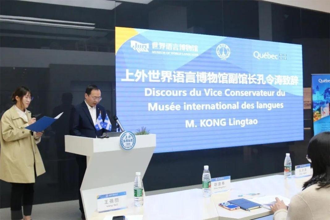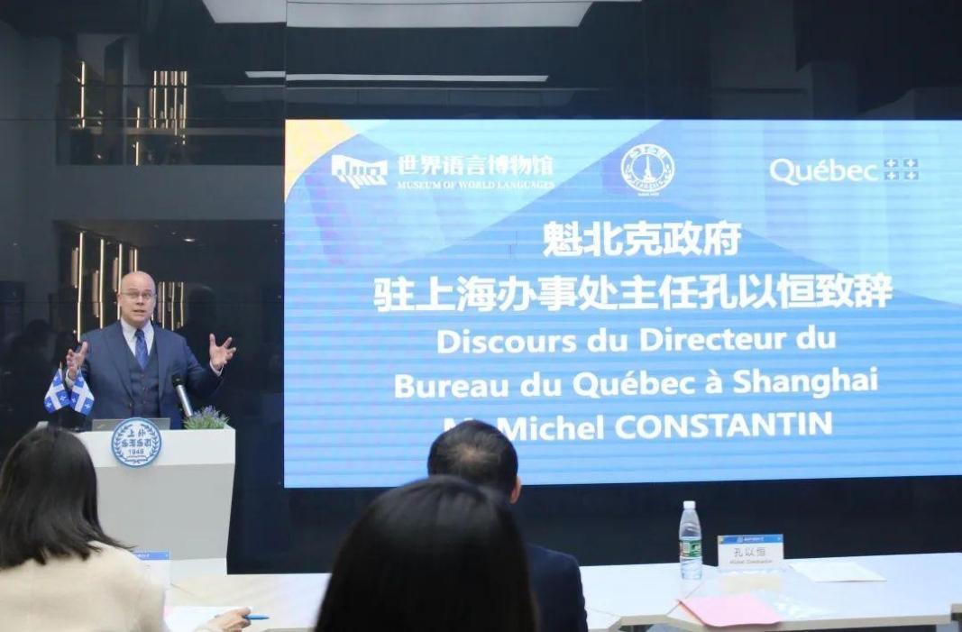 活动由法语系副主任王蓓丽主持,上外语言博物馆副馆长孔令涛代表上外世界语言博物馆致辞。受邀出席本次活动还有:上外语言博物馆副馆长周源源,法语系党委书记忻炯俊,法语系主任、魁北克研究中心主任王海洲,法语系外教菲利普·杰奎琳,魁北克政府驻上海办事处教育文化公共事务官员赵逢春及高级行政专员丁垚。