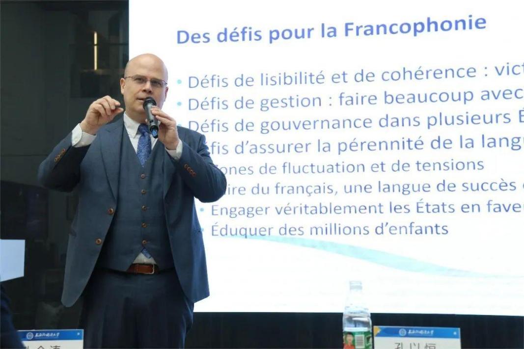 320日“联合国法文日”当天上午,上海外国语大学法语系、上外魁北克研究中心、上外世界语言博物馆携手魁北克政府驻上海办事处共庆联合国法文日(Journée de la langue française aux Nations Unies),并举办了一场名为“法语国家及地区组织 :起源和主要任务”的专题讲座。本次讲座系研究生学术训练营新学期首场讲座,主讲人为魁北克政府驻上海办事处主任孔以恒先生(Michel Constantin),讲座内容围绕法语国家及地区组织(OIF)的背景起源、发展历程、组织成员以及当今面临的挑战与机遇展开,并与法语系师生针对相关话题展开互动交流,参会师生收获满满。