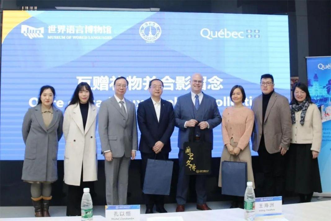 随后,孔令涛副馆长与孔以恒主任分别代表上外世界语言博物馆与魁北克政府驻上海办事处互赠礼物并合影留念。