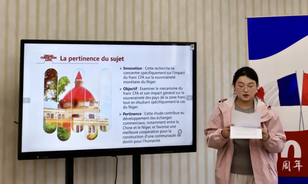 毛昕瑜同学分享的主题为《非洲法郎对法郎区国家主权的影响——以尼日尔为例》(L’impact du franc CFA sur la souveraineté des pays de la zone franc : le cas du Niger)。基于尼日尔的实际经济形势,她探讨了非洲法郎对于法郎区国家经济主权产生的影响,并对货币依赖、财政政策自主性的复杂关系进行了细致分析。
