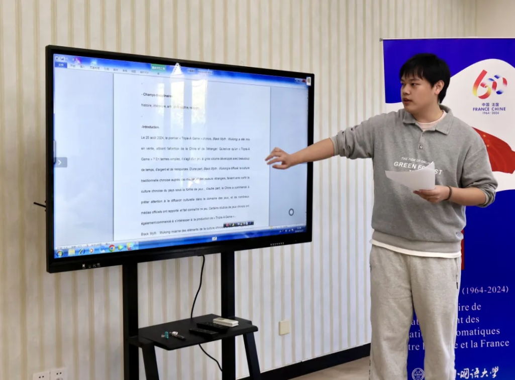 夏译文同学分享的题目是《中法游戏文化输出的比较研究——以〈黑神话:悟空〉与〈刺客信条:大革命〉为例》(Étude comparative de la diffusion culturelle dans les jeux chinois et français : le cas de Black Myth : Wukong et Assassin’s Creed : Unity)。通过对两部游戏作品的深入比较,他剖析了两国在游戏文化输出方式上的差异,探讨了两国游戏作为跨文化交流媒介的发展趋势。