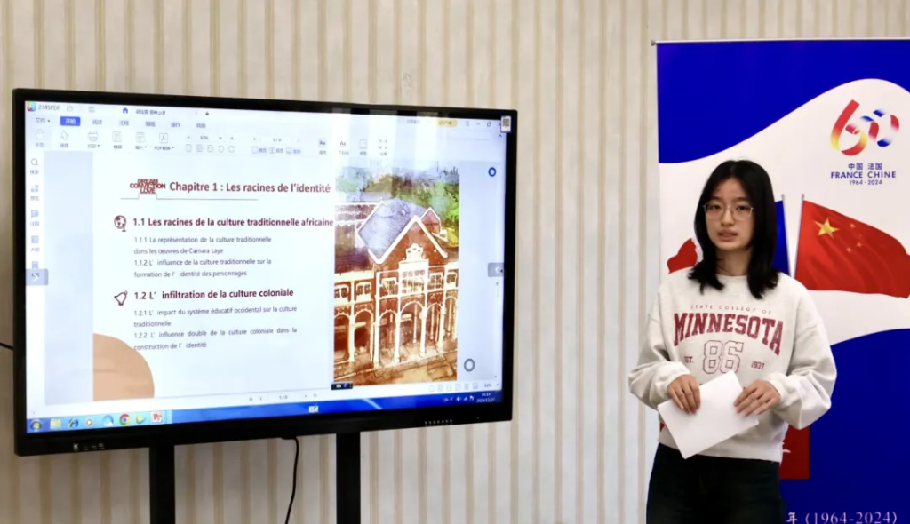 胡佳雯同学以《根与天际之间——卡马拉·莱作品中身份认同的冲突与变迁》(Entre racines et horizons : déchirement et évolution de l’identité dans les œuvres de Camara Laye)为题,聚焦于几内亚当代作家卡马拉·莱的多部代表作,深刻阐释了作者在其作品中就身份认同问题展开的思索。