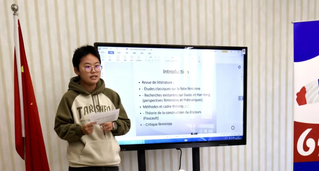 潘加同学以《女性疯癫的叙事与意义:玛格丽特·杜拉斯〈劳儿之劫〉与韩江〈素食者〉比较研究》(La folie féminine : narration et signification dans Le Ravissement de Lol V. Stein de Marguerite Duras et La Végétarienne de Han Kang)为题,揭示了两位作家在描绘女性疯癫上的异同,并对叙事手法所蕴含的深层意义进行了细致阐释。