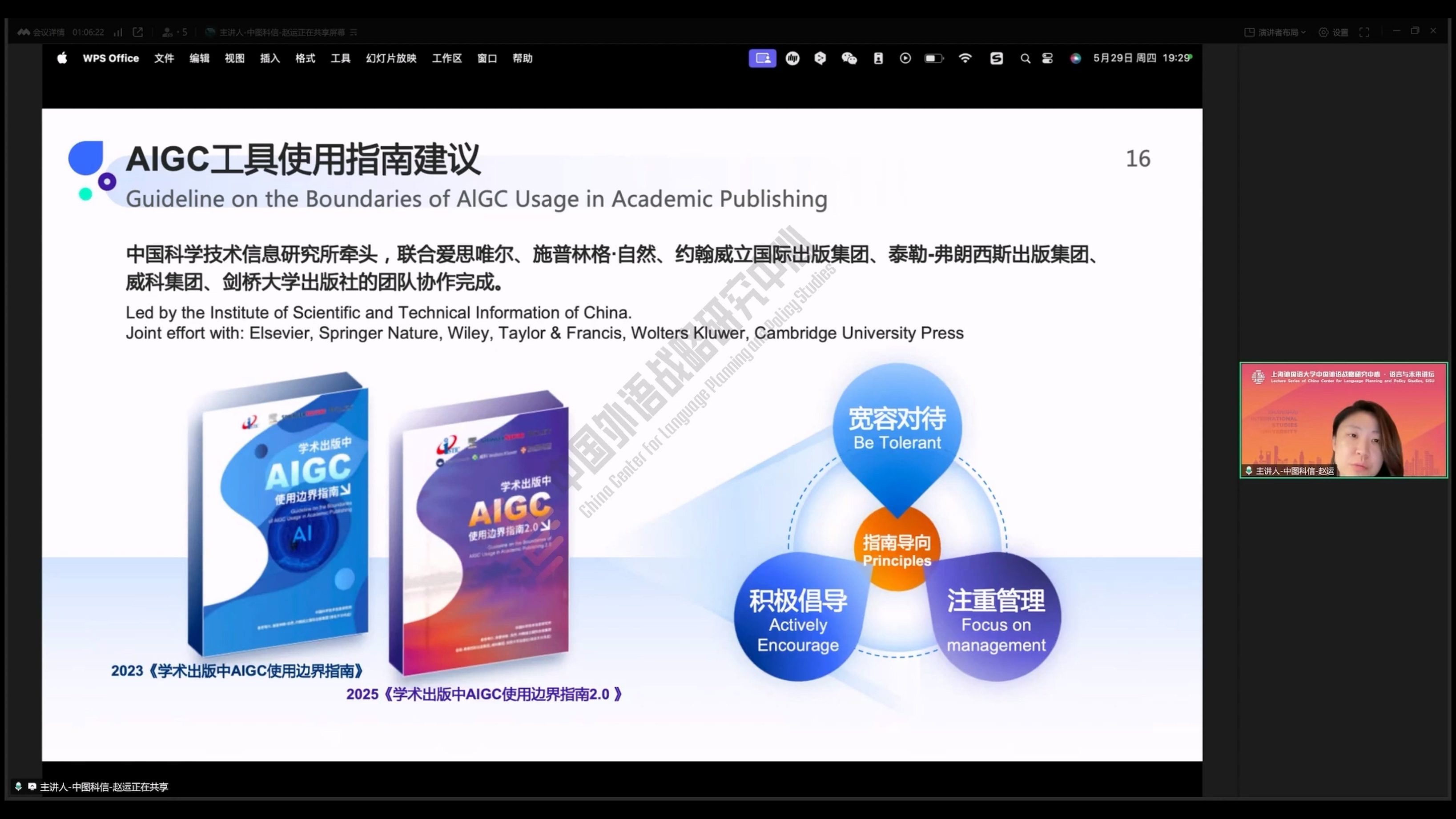 2025年5月29日,中图科信数智技术(北京)有限公司知识管理解决方案专家、上海外国语大学出站博士后赵运做客“语言与未来讲坛”,做了题为《人工智能在学术写作中的应用与探索》的学术讲座。本次讲座由上海外国语大学赵蓉晖教授主持,数百名师生线上参加了本次讲座。