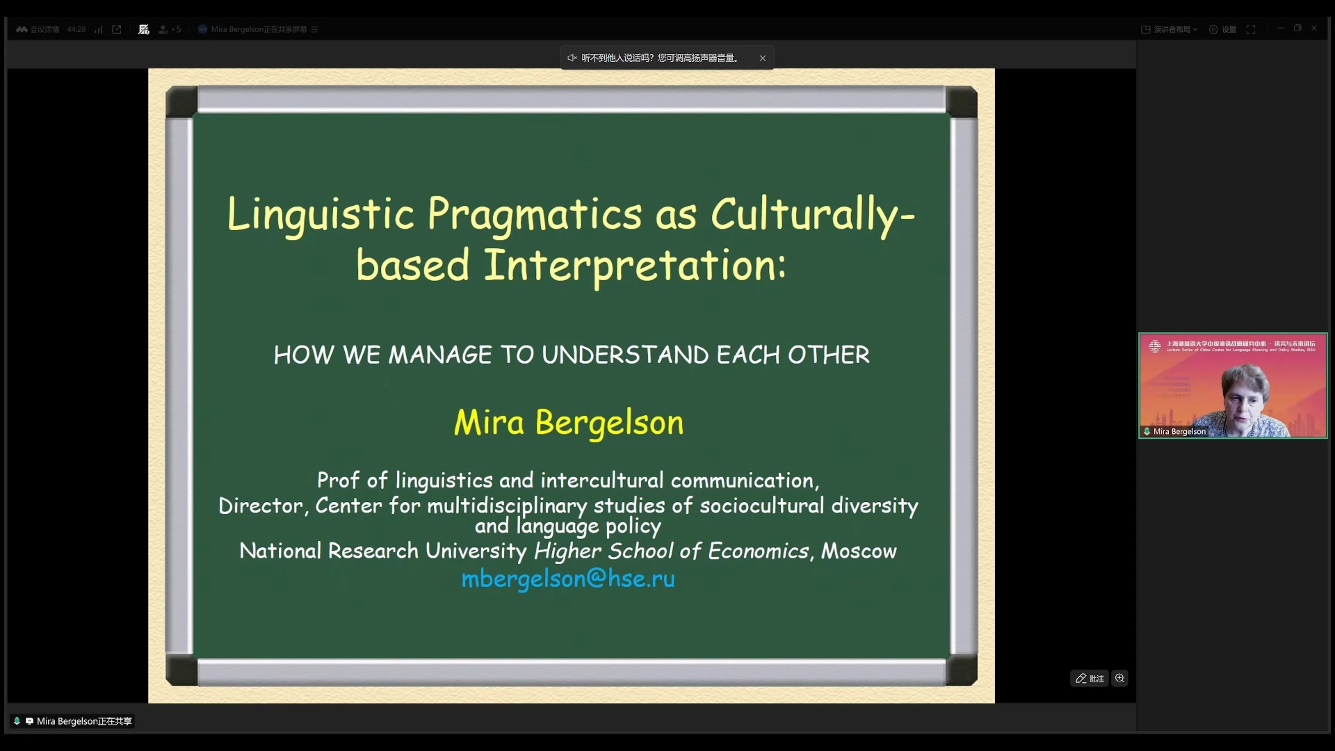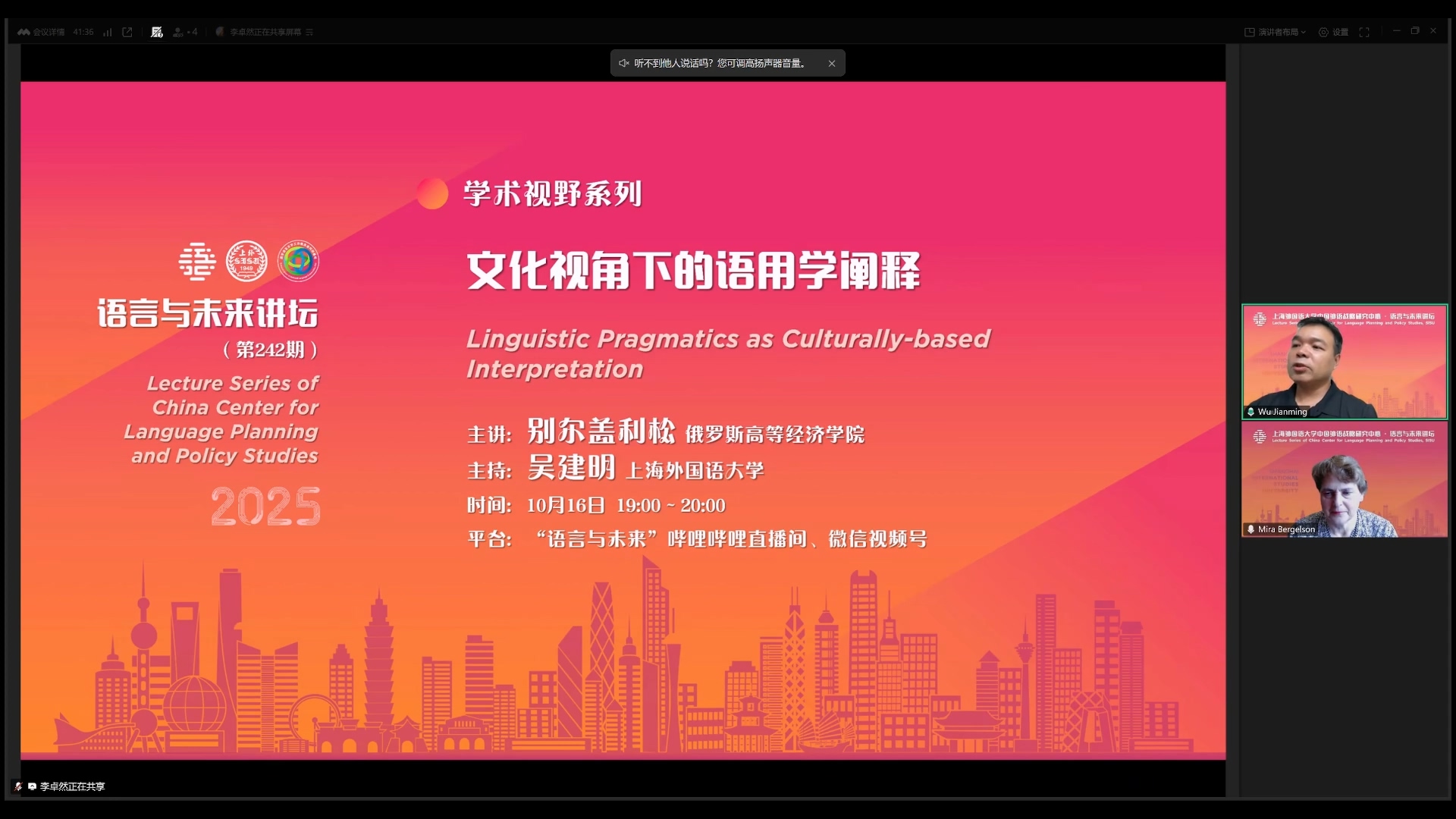 2025年10月16日,俄罗斯高等经济学院别尔盖利松教授做客中国外语战略研究中心“语言与未来讲坛”,做了题为《文化视角下的语用学阐释》的学术讲座。本次讲座由中心吴建明副教授主持,百余位师生线上参加本次讲座。