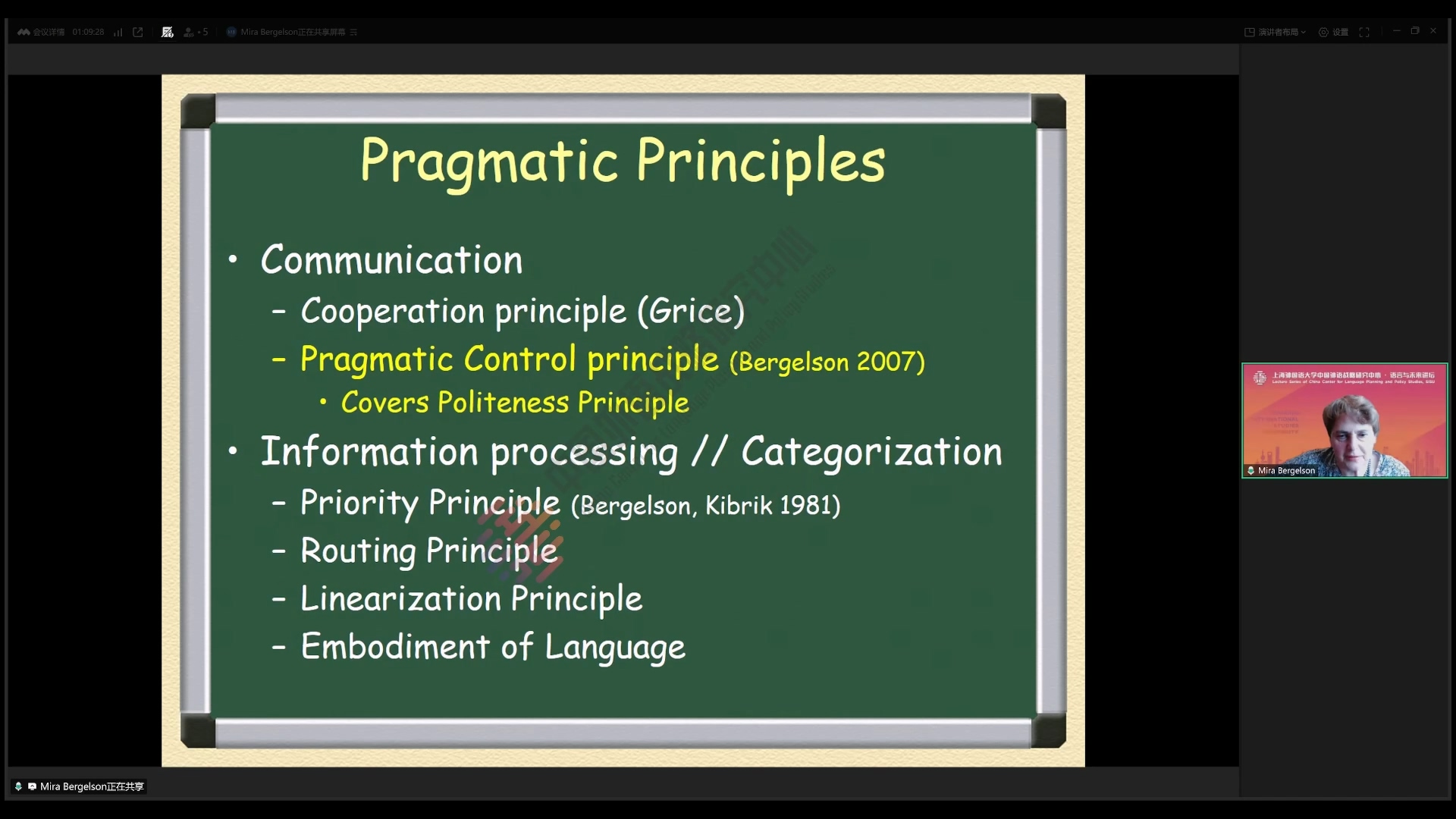 讲座伊始,别尔盖利松教授即点明人类语言的三重属性——生物、心理与社会现象,强调语言研究需突破单一维度。她以三头龙为隐喻生动指出,若仅聚焦语法、词汇等表层符号(如“砍掉一龙首”),无法把握语言在社会中的真实功能,必须同步关注其认知基础与文化嵌入性。她援引语言学家 Wallace Chafe(2018)在《基于思想的语言学》中的观点,提出“语言始于言说者的思维,终于听者思维的受影响”,明确语言是“思想-声音联结的工具”,而非单纯的符号系统。讲座核心围绕语用控制原则(Pragmatic Control Principle)展开。别尔盖利松教授将其定义为“言说者对自身针对受话者特定交际行为权利的评估”,涵盖对受话者行为的控制权限。她通过多案例解析该原则的应用场景:如“我命令你打喷嚏”这类祈使句,因言说者无法控制他人生理行为,违背语用控制逻辑而显荒诞;某健身俱乐部“请勿在淋浴房洗鞋”的告示,若受话者拒绝接受“洗鞋需在淋浴房”的潜在文化预设,便会引发冲突。她进一步指出,语用控制的强弱受社会文化规范、人际距离、专业背景等因素影响,例如媒体访谈中专家掌握内容话语权,主持人则控制对话流程,形成分裂式语用控制。此外,别尔盖利松教授提出“叙事是间接认知与表达的核心工具”。她援引 J. Gottschall在《讲故事的动物》中的观点,指出人类通过叙事构建“另类现实”,且叙事分析可揭示言说者的潜在价值观——如通过生活叙事中的评价段落、副语言信号(笑声、停顿、语速变化),这为社会语言学研究提供了新路径。