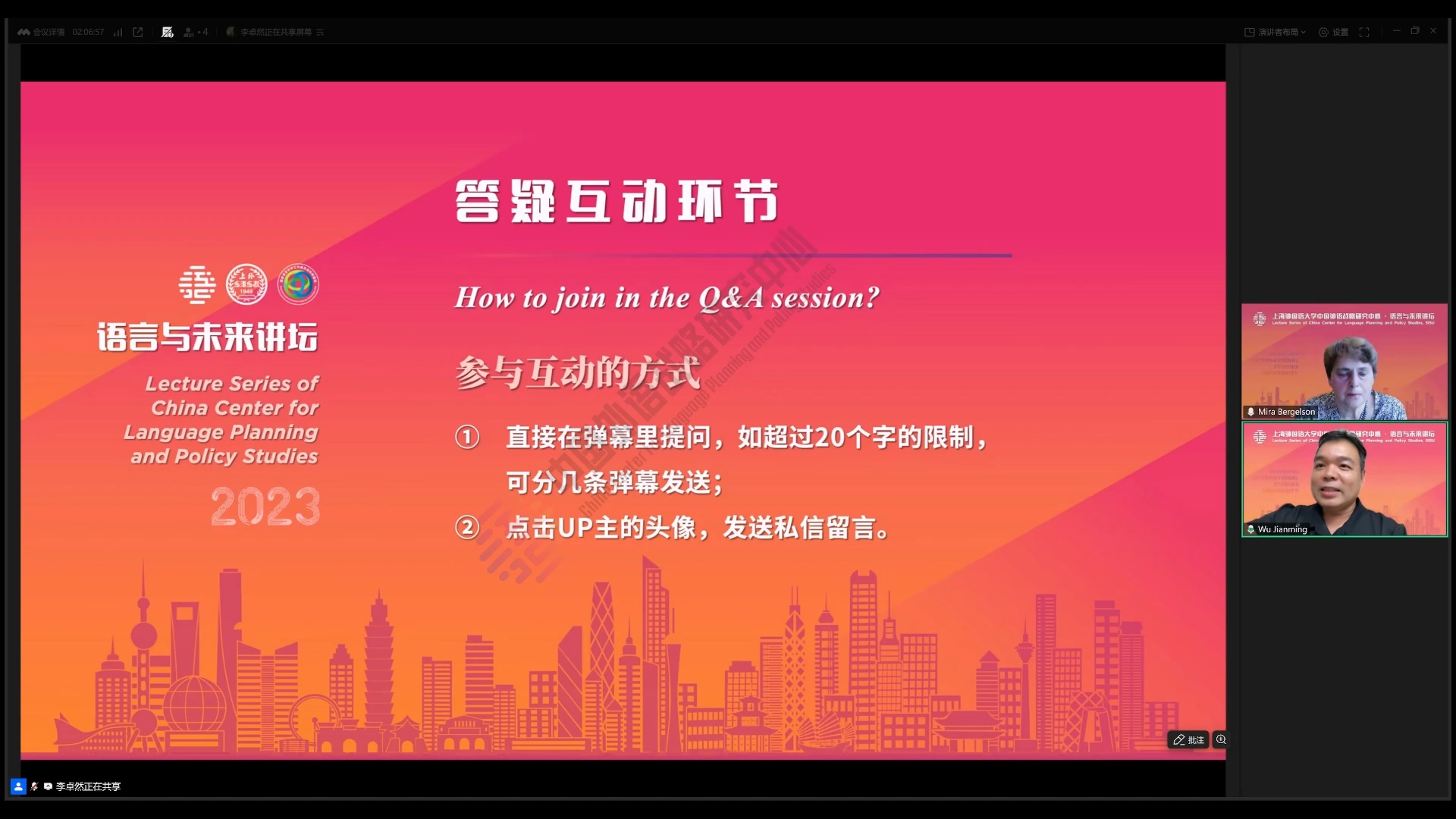 互动环节中,观众围绕“语用控制与合作原则的差异”“全球化下多元文化思维的混合性”“社交媒体夸张语言的语用逻辑”等问题提问。别尔盖利松教授在回答中认为语用控制比Grice合作原则更具包容性,前者涵盖互动中的权力关系与文化适配性,后者仅侧重信息交换的逻辑性。对于多元文化思维,她认为多语言者的“文化认知”虽可能产生价值观矛盾,但也能带来多视角认知优势,如俄语雪下花(подснежник)、英语雪铃花(snowdrop)的命名差异,即反映不同文化对自然的认知视角。吴建明副教授在总结中指出,本次讲座为语用学研究提供了“文化嵌入”的新视角,其提出的语用控制原则与语言文化图式理论,对跨文化沟通实践、外语教育中的文化教学均具重要启示。