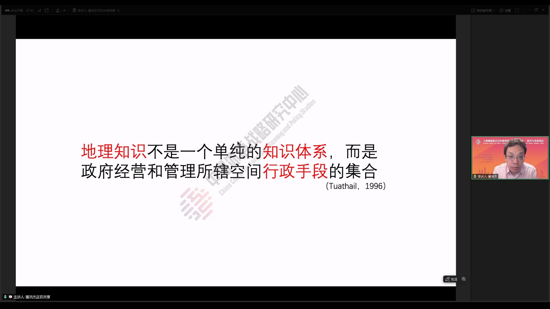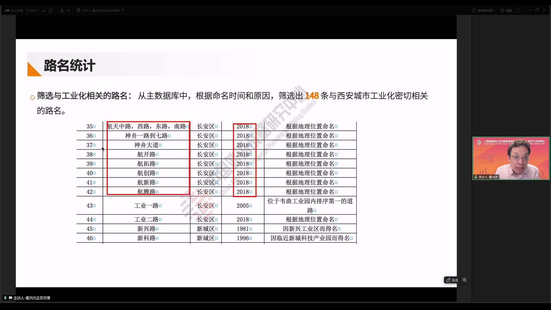 讲座伊始,董洪杰教授梳理了Tuathail、Rusu、Duncan、Baker、Hall、Lefebvre等学者对路名作用的观点,以及国内外对道路命名的相关研究,提出本研究以地理知识与空间治理的基础框架,将道路命名与公共治理看作社会功能的扩展,从符号学视角探索道路命名的实践,从文化生产视角分析路名的动态构建。接着,董教授详细介绍了研究的数据来源,包括历史地图、地方志、在线资源(中国国家地名信息库、高德地图、百度地图)、城市规划档案等,并对收集到的数据示例和构建的路名数据库依次做了细致展示。董教授进而介绍了从主数据库中筛选出与工业化相关路名的方法,并举例说明路名勾勒了西安从手工业到高新产业的工业化发展脉络,路名群记录和彰显着西安产业园区的形成与聚集,路名的产生和演变反映社会治理理念的变化,标记城市空间的布局调整。