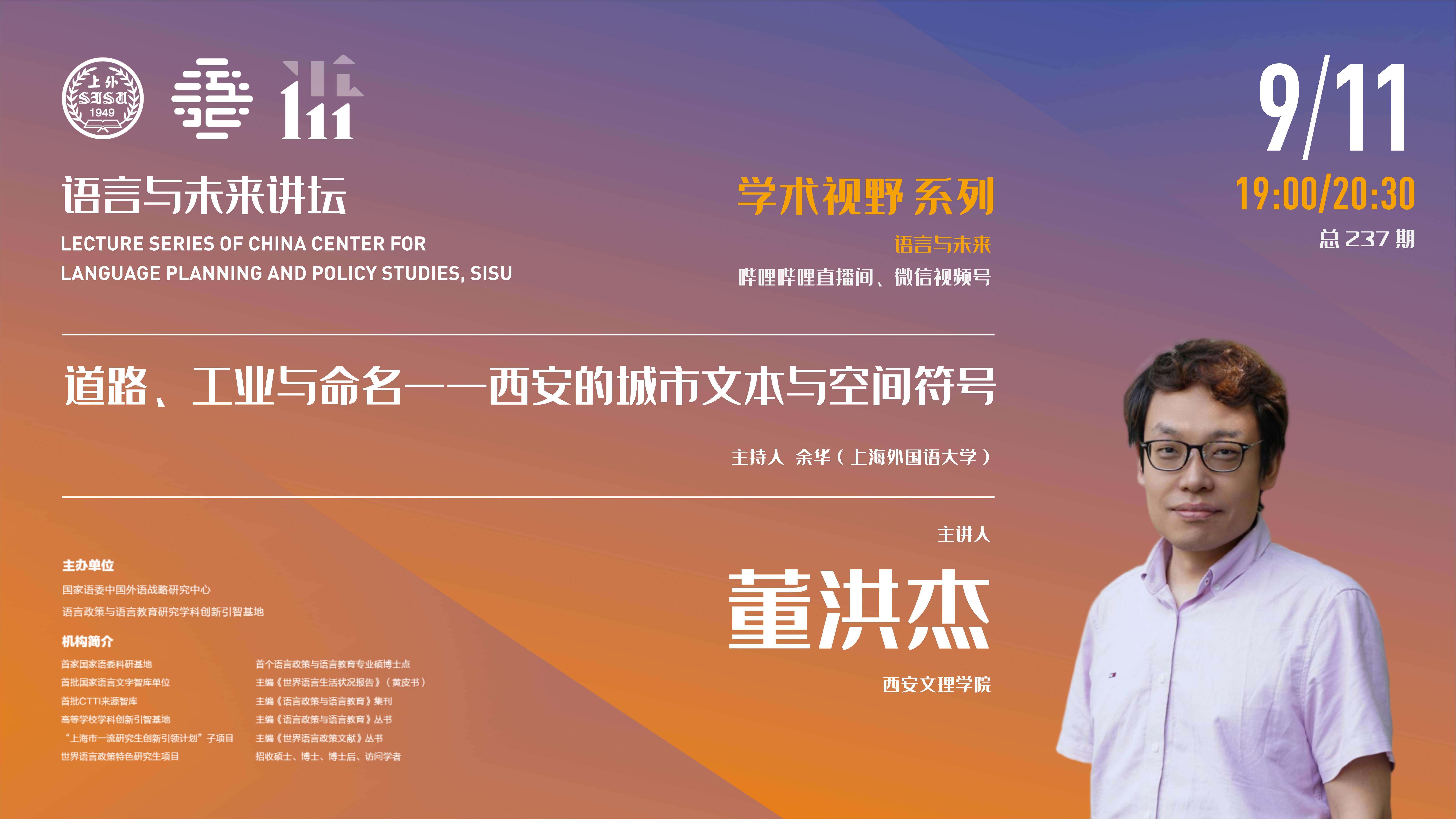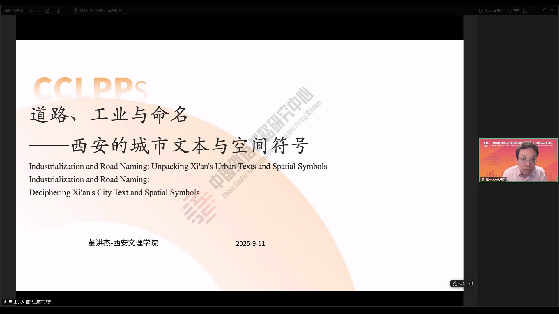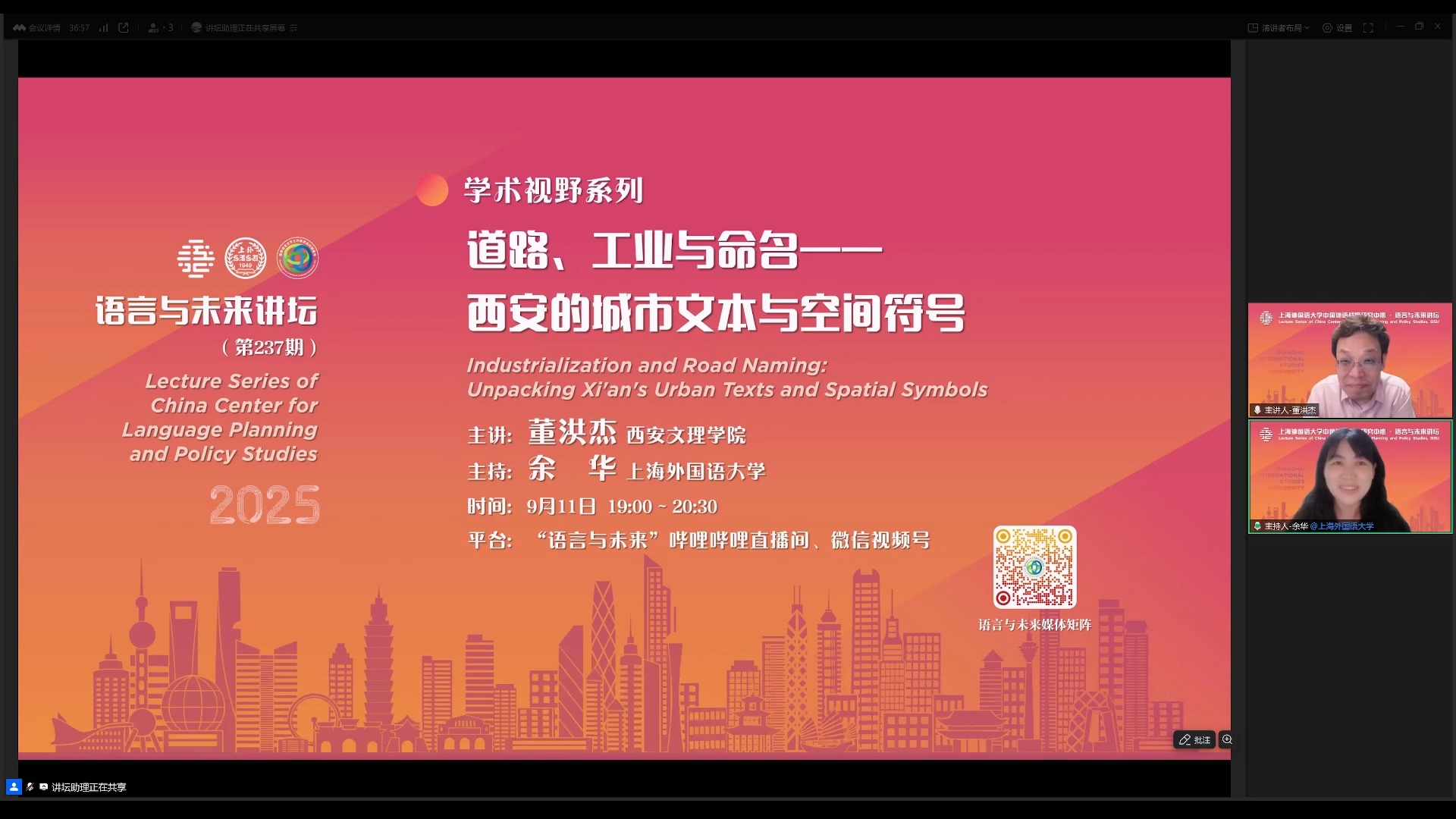 2025年9月11日,西安文理学院国际教育学院、文学院副院长董洪杰教授做客“语言与未来”讲坛,做了题为《道路、工业与命名——西安的城市文本与空间符号》的学术讲座。本次讲座由上海外国语大学余华副教授主持,数百名师生线上参加了本次讲座。