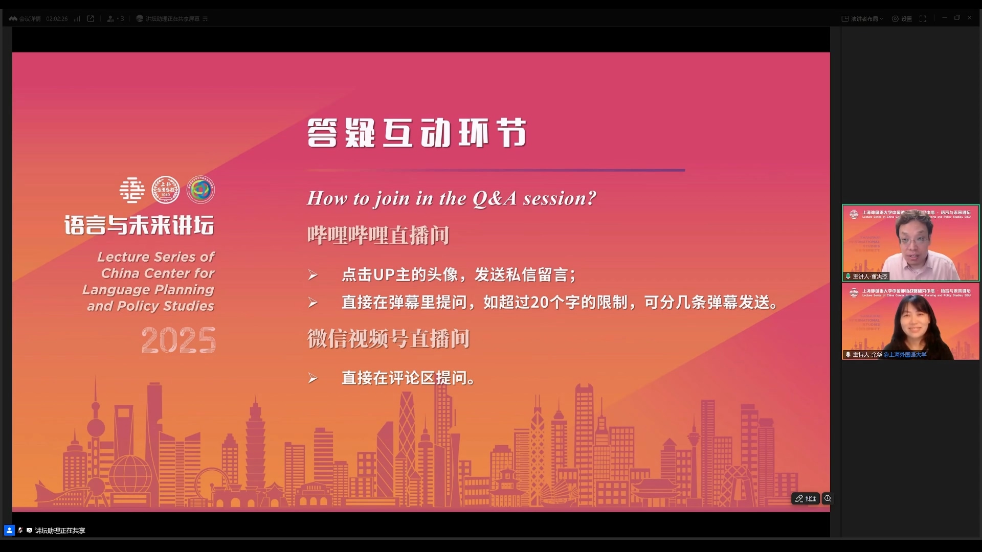 在讲座的互动环节,在线观众围绕谁拥有路名的命名权、本地居民如何看待路名的变迁、路名体现的隐喻和转喻、路名在街区实际语言景观中的呈现形式等话题进行了提问,董教授鼓励听众将研究拓展至其他城市空间符号甚至虚拟空间。本次讲座通过扎实的史料梳理与详实的案例分析,呈现了道路命名作为城市文本与空间符号的深层意涵,拓展了语言符号学与城市研究的交叉视野,为城市空间符号研究提供了重要启发。
