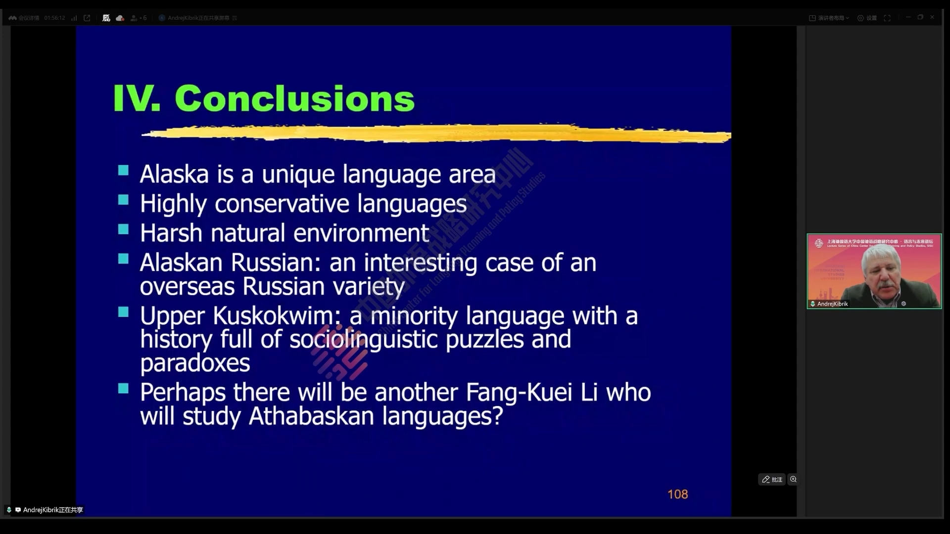 讲座伊始,基布里克教授从历史谈起,以具体的时间段划分,简要介绍阿拉斯加在史前、俄罗斯管治时期以及在美国管治后的地理风貌、人口结构、社会状况和丰富的语言资源。他以目前极度濒危的尼尔奇克俄语(Ninilchik Russian)为例子,概要分析尼尔奇克俄语在语言和语法方面与大陆俄语的显著不同,介绍道阿拉斯加即便在美国的管治之下也存有俄语混合语(Creoles of Russian American)。随后,基布里克教授从语言本地化发展的角度,分析俄语在俄治阿拉斯加时期,与土著语言的接触与具体的地理分布。他以著名语言学家萨丕尔和李方桂师徒的研究为范本,系统回复学界、其个人及团体在阿拉斯加等地开展社会语言学研究,分析阿拉斯加诸语言的借词、与英语的接触、方言变体、宗教文化与当地语言发展的关系、语言保护的社会语言学方案、当地人的语言态度和句法词法复杂性等。讲座中,基布里克教授旁征博引,还展示了多幅田野调查的现场留影、笔记等。