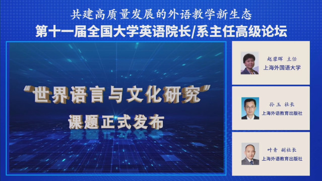 2022年4月10日,在第十一届全国大学英语院长/系主任高级论坛期间,上海外国语大学中国外语战略研究中心与上海外语教育出版社联合发布“世界语言与文化研究”课题,面向全国的外语与外语教育研究者征集研究设计方案,并将择优予以立项资助。由于疫情影响,此次活动以在线方式举办,来自全国各地的十余万人共同见证了发布活动。