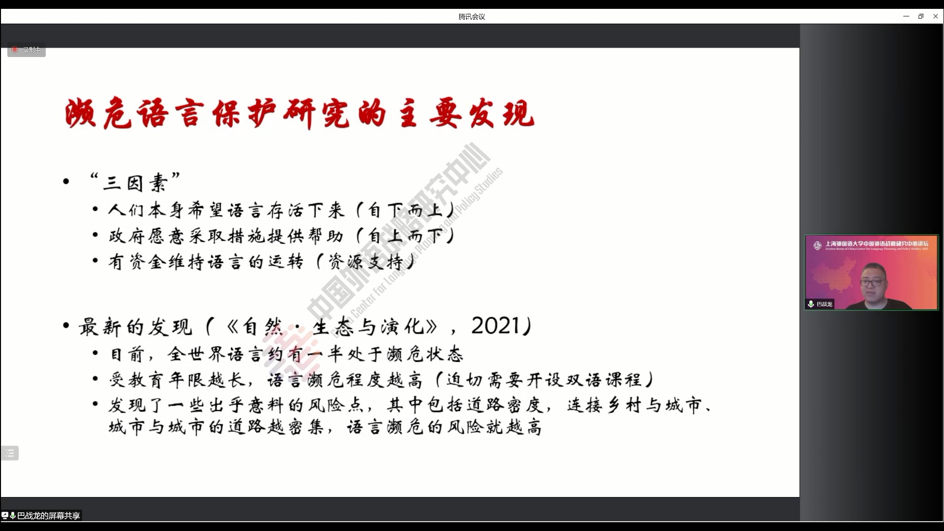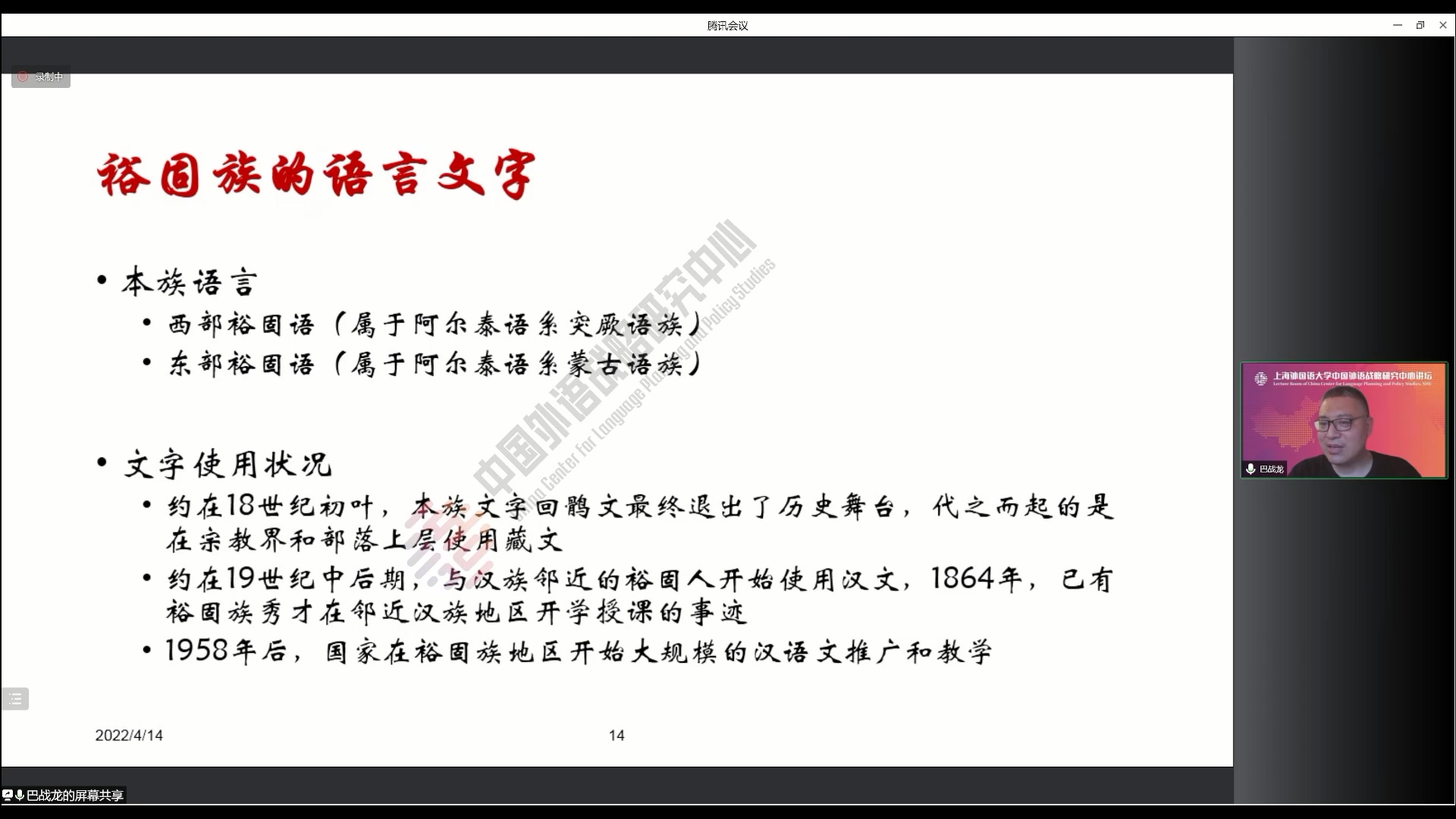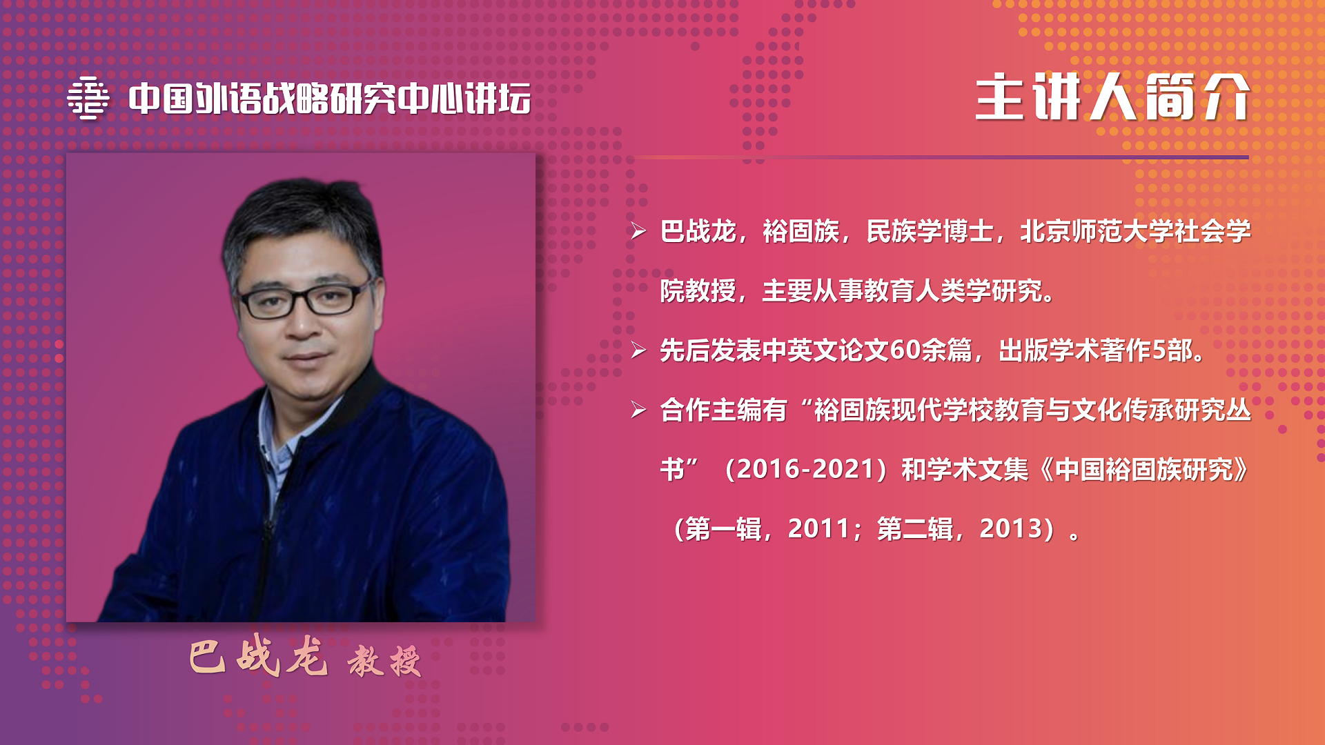 4月14日晚,北京师范大学学社会学院巴战龙教授做客“中国外语战略研究中心讲坛”,做了题为“裕固族语言文化遗产保护问题探究”的讲座。本次讲座由中心余华副教授主持,540余位校内外师生在线参加。