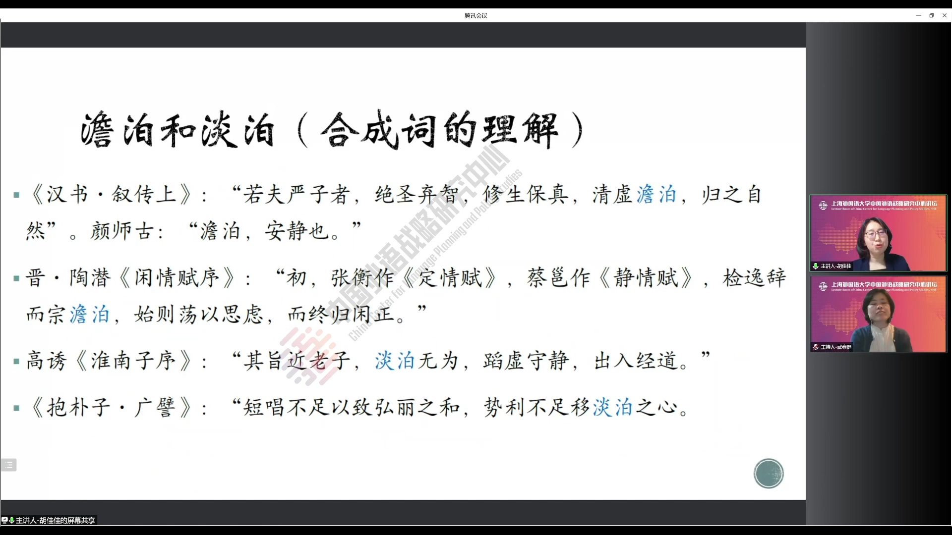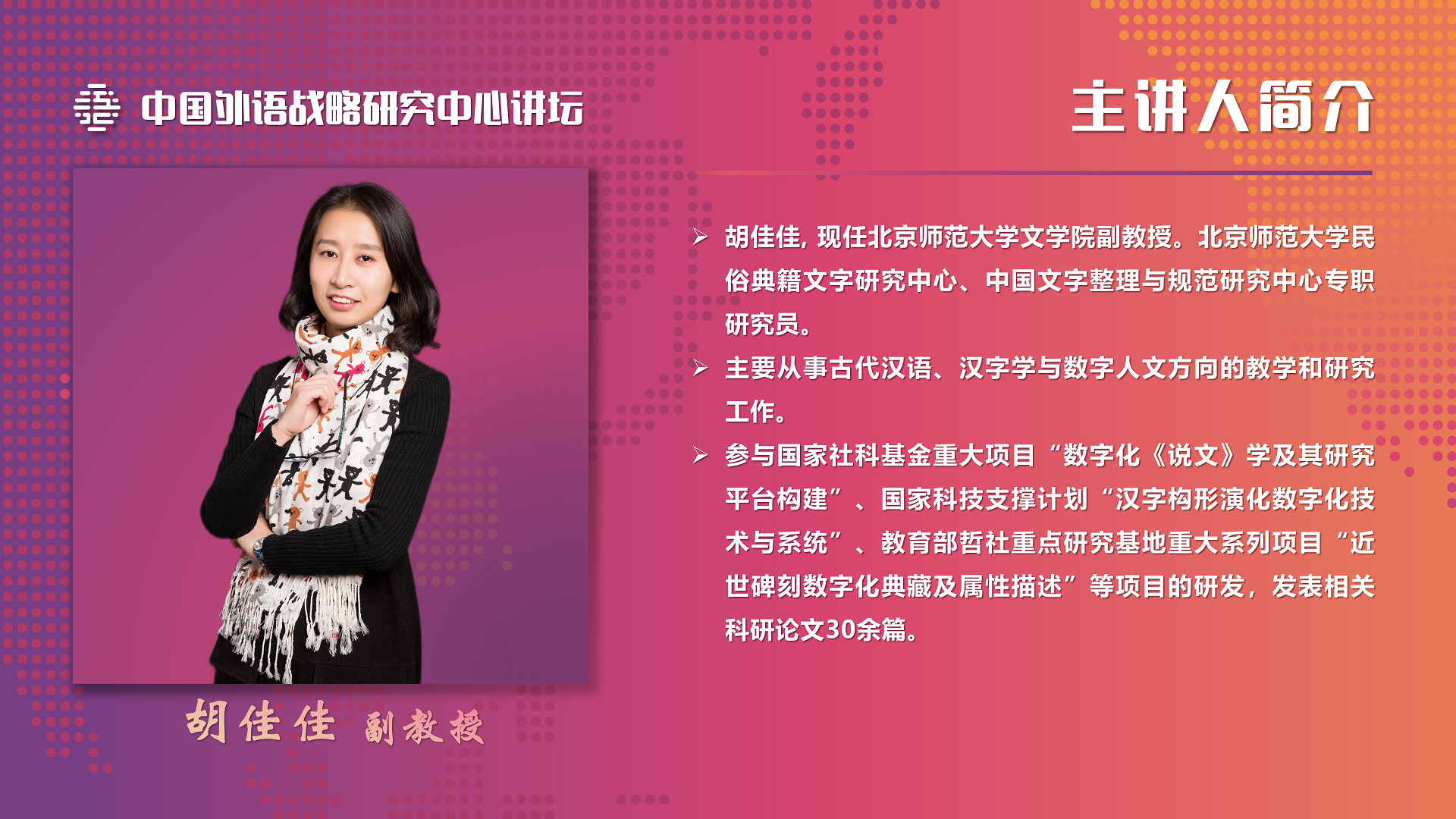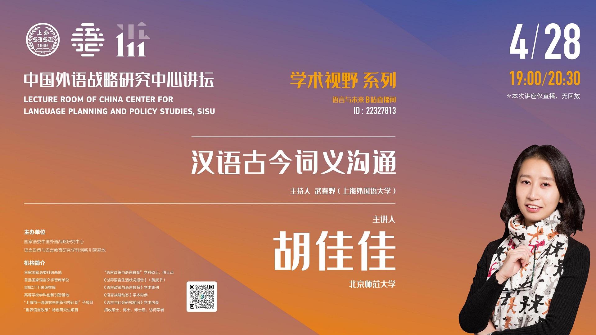 2022年4月28日晚,北京师范大学文学院副教授、中国文字整理与规范研究中心专职研究员胡佳佳于上海外国语大学举办的“中国外语战略研究中心讲坛”作了题为《汉语古今词义的沟通——利用汉字的意义》的学术讲座。讲座由中心研究员武春野主持,400余位校内外师生线上参加。