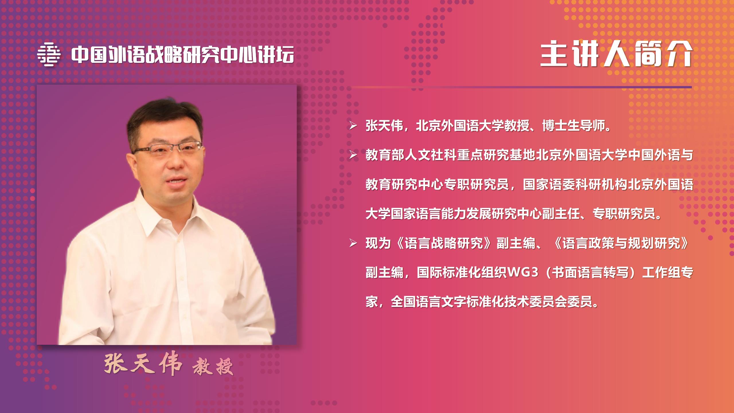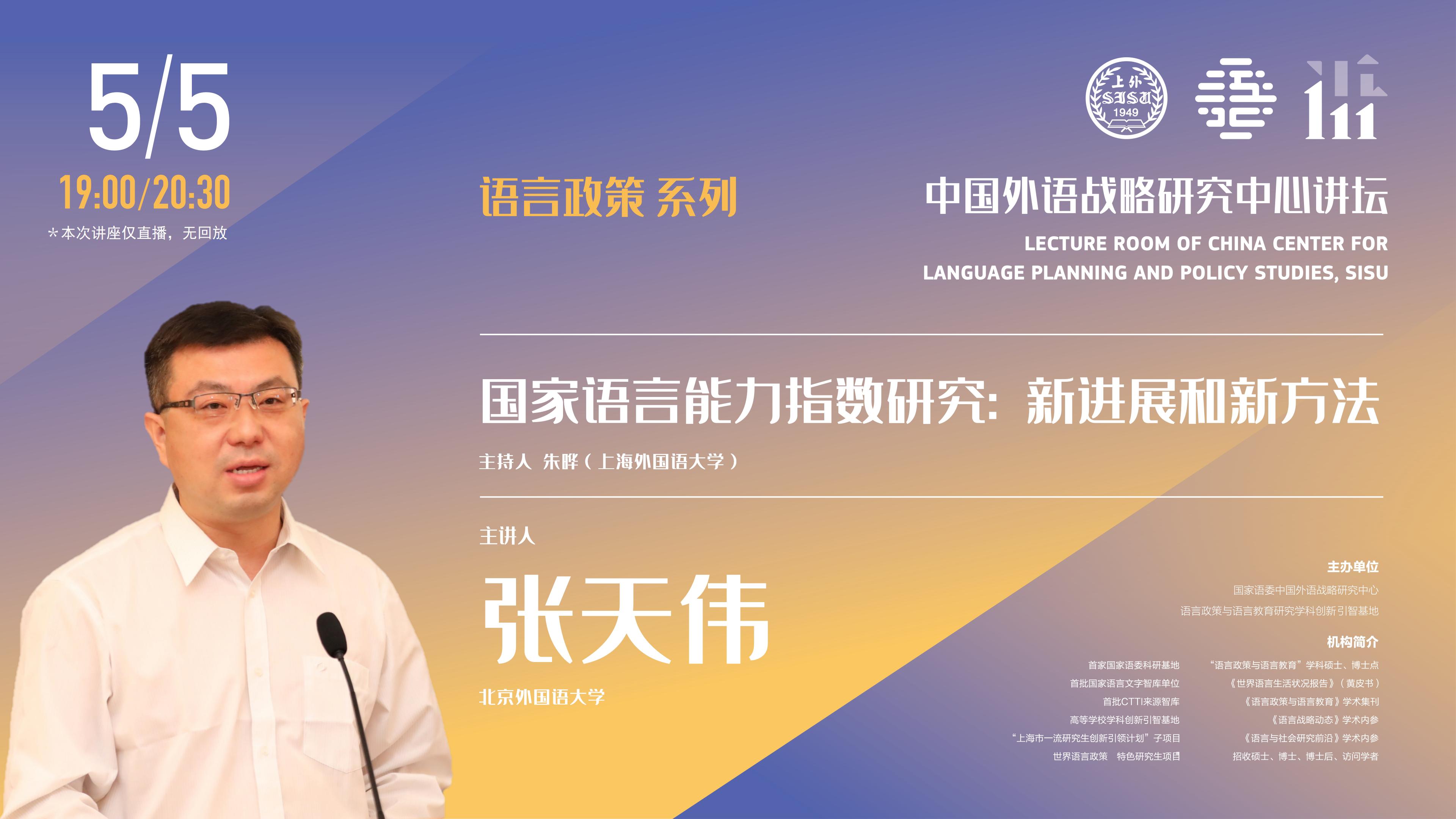2022年5月5日晚,在上海外国语大学 “中国外语战略研究中心讲坛”上,北京外国语大学国家语言能力发展研究中心副主任张天伟教授做了题为《国家语言能力指数研究新进展和新方法》的学术报告。中国外语战略研究中心副主任朱晔主持讲座,近500位校内外师生在线参加了此次讲座。