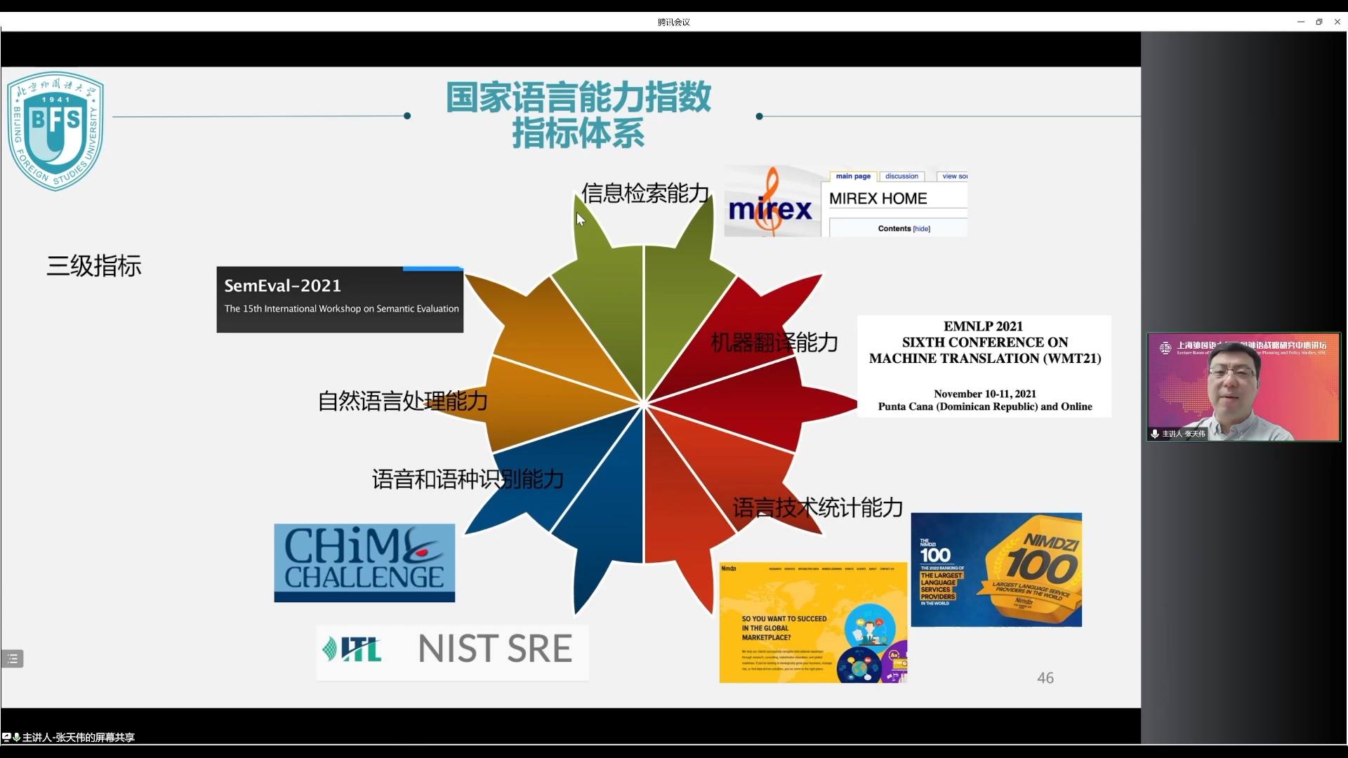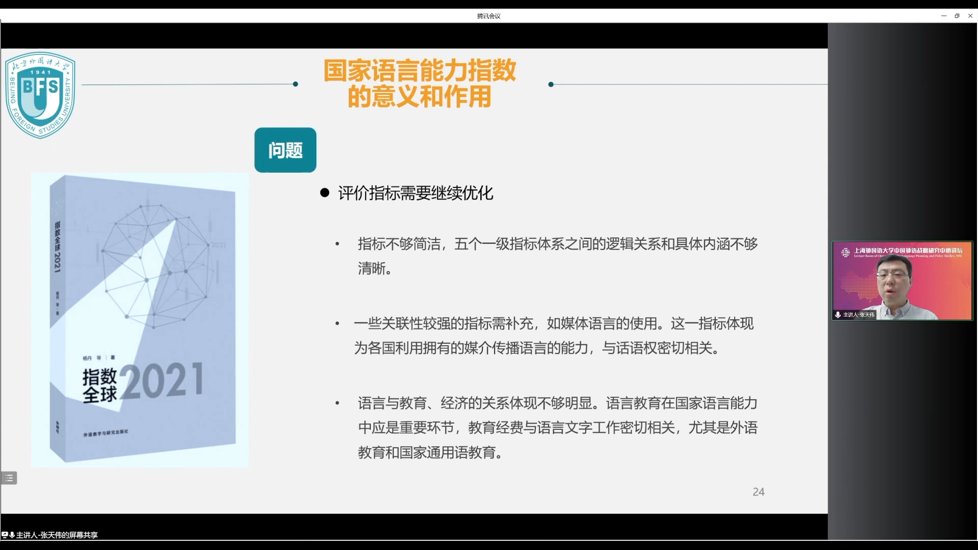 张天伟教授从国家语言能力的历时发展、国家语言能力指数的意义与作用、国家语言能力指数指标体系、研究方法、结果与分析、启示与思考等进行阐述。张老师首先介绍了古今中外语言和国家间关系的发展阶段,即内向、共生和外向关系。他指出,国家语言能力是一个国家软实力和综合国力的重要体现,越来越多的国家意识到国家语言权力和世界语言多样性的重要性,在这个过程中逐渐形成了国家语言能力的概念及相关思考。他介绍了文献研究和指数研究的优缺点,对国家语言能力指数的意义和作用进行了阐述,从而引出国家语言能力指数的定义以及量化三要素——数据、合成和权重。
