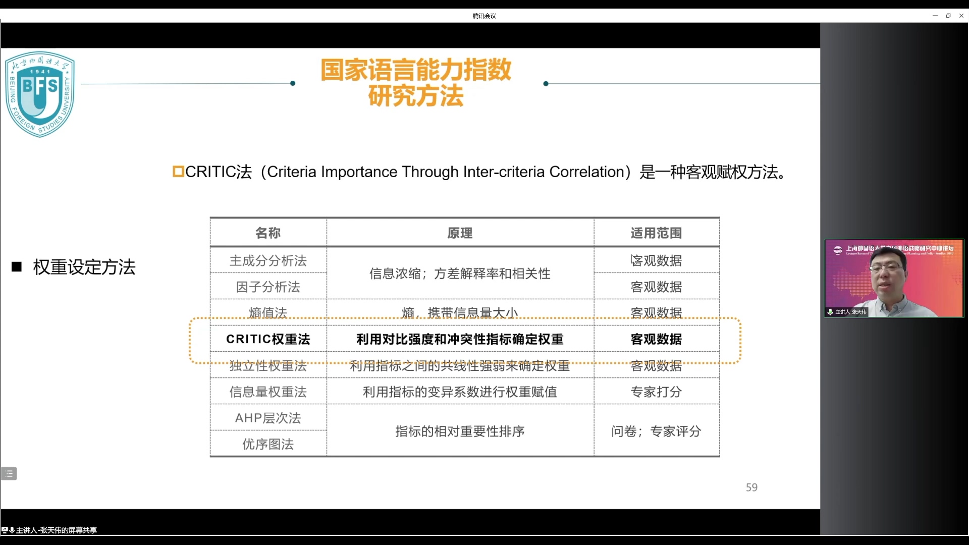 随后,张教授简要回顾了他的团队去年构建国家语言能力指数指标体系及相关成果的情况,并在客观认识其缺陷的基础上,今年根据简洁性、包容性、可复制性及代表性四个原则,重新调整了国家语言能力指数的指标体系,将去年成果简化为3个一级指标,10个二级指标,32个三级指标。他结合自己在调整时的考量、数据来源以及相关案例等,详细介绍了重新调整后的各级指标。随后,张老师介绍了研究方法的调整情况,即采用层次分析法、因子分析法、CRITIC权重法、专家评价等多种方法,从主观和客观两个角度来设定权重。张老师为大家呈现了今年的各国语言能力指数,并简要阐述了二级指标中的分析结果,指出国家语言能力与经济排名有一定相关性,而同一国家不同指标之间的相关性不强,就中国而言,总体能力较强,但在话语权和规划方面有所欠缺。