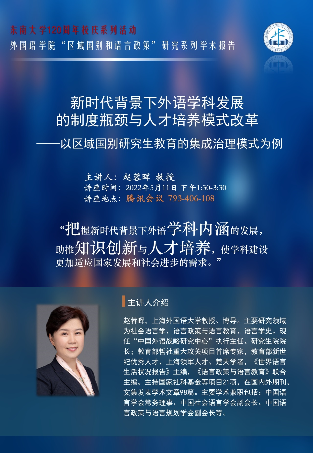 讲座 | 赵蓉晖:新时代背景下外语学科发展的制度瓶颈与人才培养模式改革——以区域国别研究生教育的集成治理模式为例