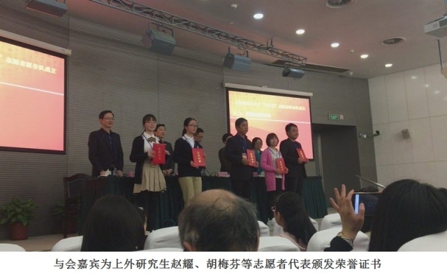 成立仪式由市语委副主任、市教委语管处处长凌晓凤主持。市语委副主任、市教委秘书长王从春、市文明办志愿服务工作处副处长俞伟、市教委德育处副处长江伟鸣、外语战略研究中心副主任朱晔副教授出席了成立仪式,并为志愿者代表颁发了荣誉证书。