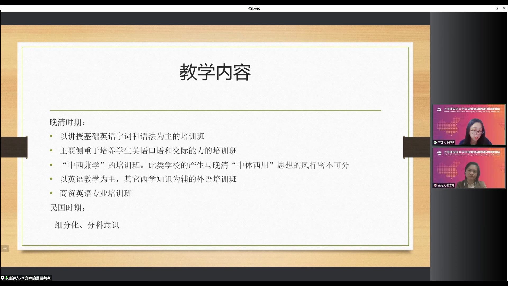 在互动交流环节,李亦婷老师解答了近代上海外语培训机构中女性的参与情况,并肯定了女子学校在为女性提供受教育机会、获得经济独立和人格独立等方面的积极作用。此外,李老师补充指出:该时期的外语培训教育也充分体现了红色元素,为爱国救亡运动培养了大批革命者和进步人士。