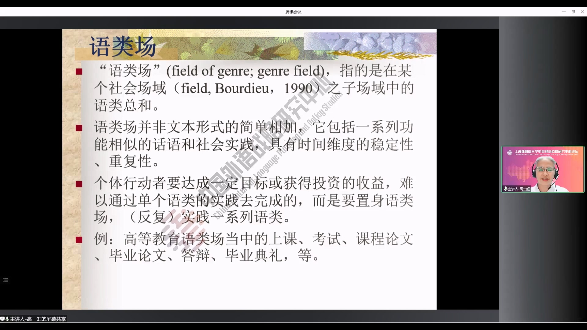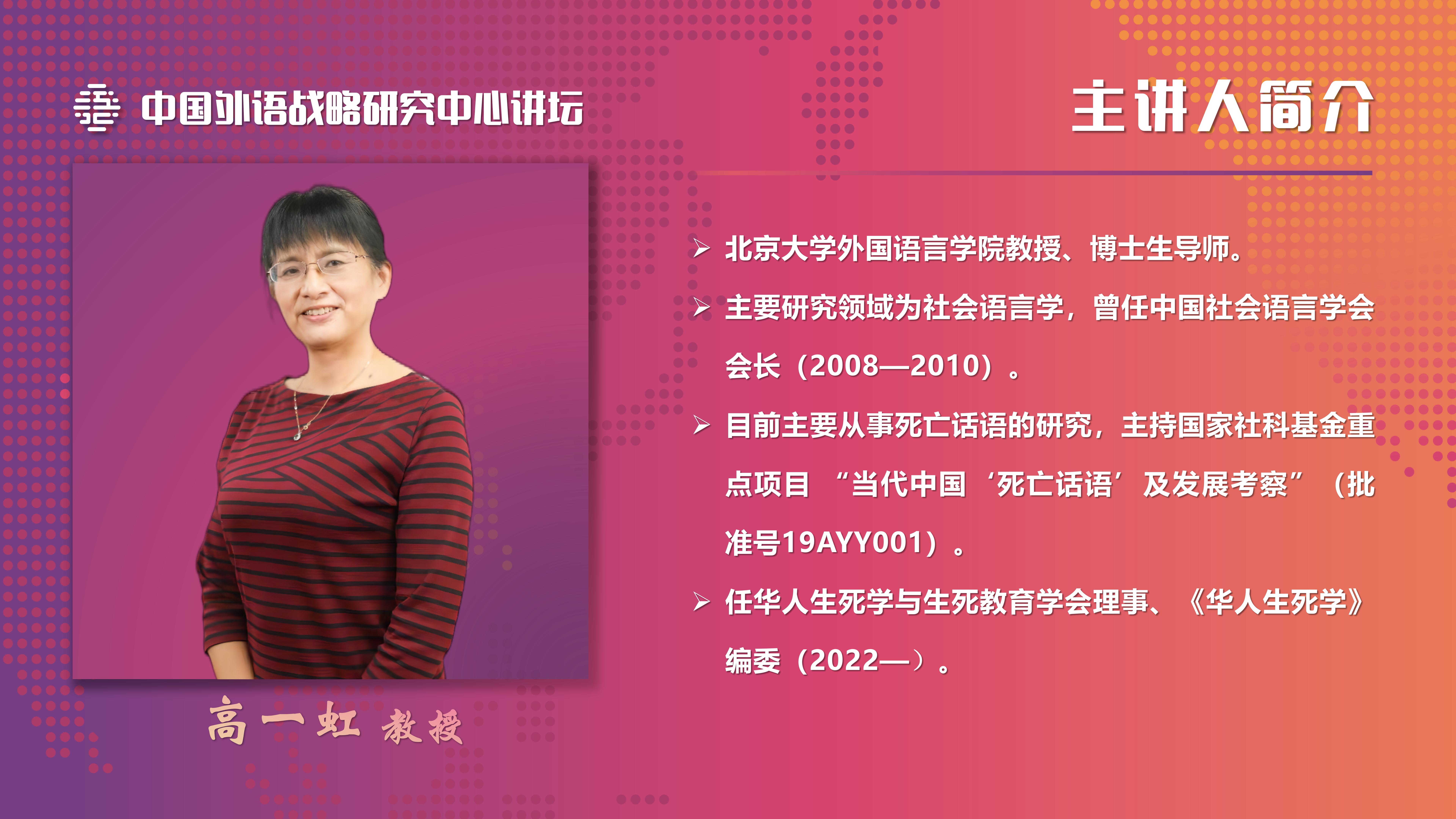 2022年8月29日,北京大学外国语言学院教授、博士生导师高一虹做客“中国外语战略研究中心讲坛”,做了题为《我国新兴安宁疗护语类场中的四个语类》的学术讲座。本次讲座由上海外国语大学刘媛媛老师主持,来自全国各大高校和研究机构的师生400余人以在线方式收看了本次讲座。