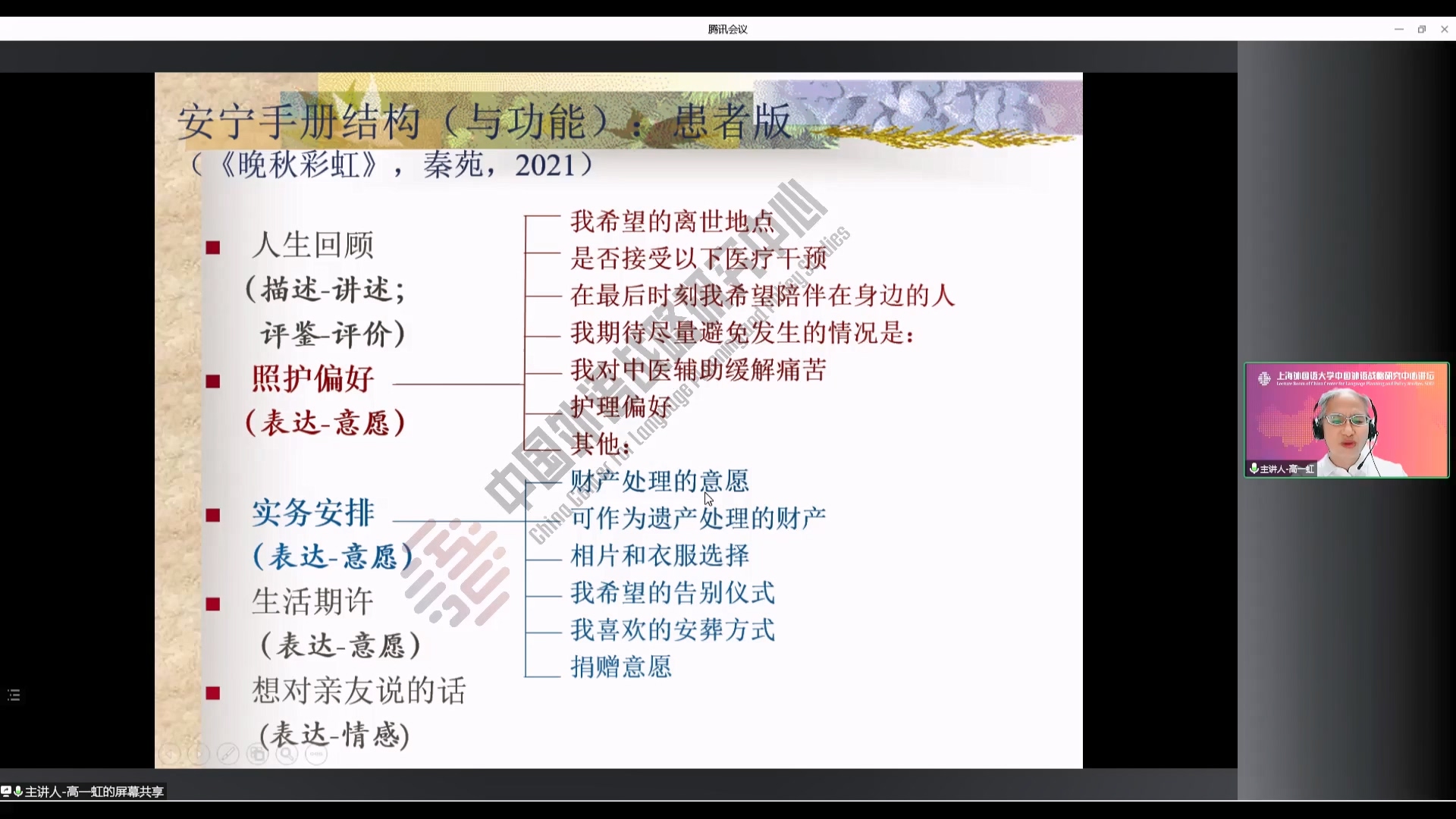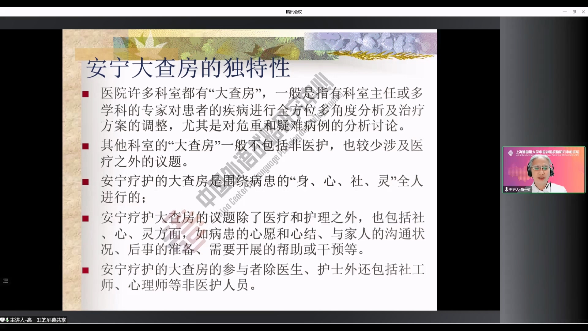 讲座伊始,高一虹教授对本次讲座涉及到的关键概念做出了解释和说明。在社会语言学的视角下,根据功能和活动类型的不同,“话语”(discourse)可以被分为不同的类别,即“语类”(genre)。“语类场”(field of genre)则是指在某个社会场域之子场域中的语类总和。在我国情境,“安宁疗护”的这一医疗场域中的新兴子场域正在持续形塑一系列新的语类,其中具有代表性的四个语类是:家庭会议、大查房、生命回顾和安宁手册。随后,高老师从参与者、主要功能、必要性、独特性、主要符号形式这五个语类参数入手,分别对安宁疗护中的四个语类做出描述,并基于现有的研究和实践,以大量的图片、文字等真实记录为例,向听众展示了新语类形成过程中,传统的治愈性医疗理念和新兴安宁疗护理念的博弈和协商。