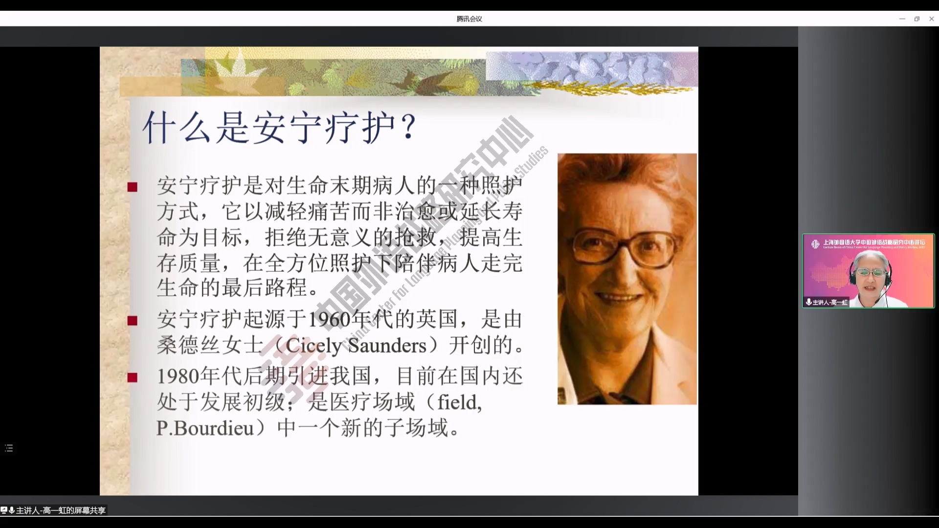 在讲座接近尾声时,高老师从法国社会学家布迪厄的场域、资本、惯习理论出发,对安宁疗护场域的各个要素及关系做出总结。当今社会,我国老龄化程度加剧,在此背景下已经初步形成了安宁疗护这一新的语类场,并出现了一系列新的语类,而这一语类场也在逐渐由初始走向成熟。这种变化同样影响着人们对于死亡话语的惯习,使人们的观念经历着从忌讳谈论死亡到言说与规划死亡、从重视生命长度到重视生命质量的转变。同时,死亡话语的惯习通过反复的实践,也会反过来建构安宁疗护的场域。高一虹教授展望道,相关现象还需要社会语言学者与其他学科的学者一同携手,进行跨学科的探索。