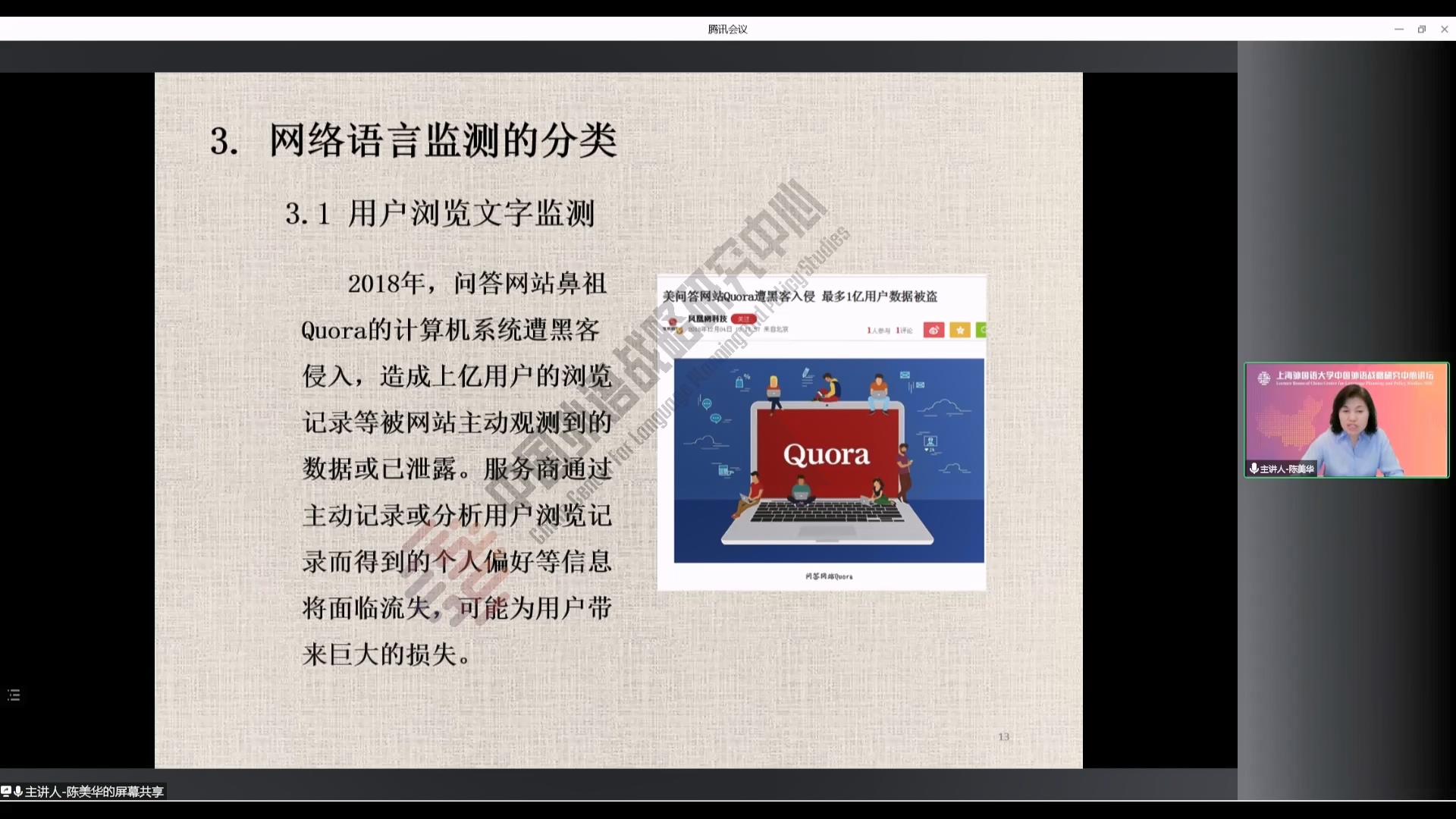 讲座伊始,陈美华教授首先介绍了生物信息安全和语言生物信息安全的概念。她指出,人类个体及群体语言表现出可识别的特征属性,从中能够提取可识别、可重复的生物特征样本数据。语言生物信息安全研究将生物安全与语言学科结合,对公民的信息安全、国家的战略布局、学科视野的延展、语言学习的深化具有重要意义。随后,陈老师阐述了网络语言监测的分类,对网络语言监测进行了根源分析,并对此进行对策分析。她将网络语言监测分为三类,包括用户浏览文字监测、用户输入文字监测、用户被动语音监测等,从商家、供应商和法律三方面解释了网络语言监测现象的根源,即以商业利益为终极目标的市场竞争、供应商过度操纵用户个人信息,以及法律监管有待完善。针对这些现象,陈老师提出如下对策,完善个人生物信息保护的法制建设、明确网络服务商保护用户生物信息安全的主体责任、提升用户对个人语言生物信息的重视程度和保护能力。接着,陈老师从研究方法、研究结果、研究主题、关键趋势多方面出发,以国外虚拟助手与用户语言生物信息安全问题研究为例,探讨如何结合我国实际情况开展网络语言监测与语言生物信息安全研究,为我国语言生物信息安全问题提供思路和启示。