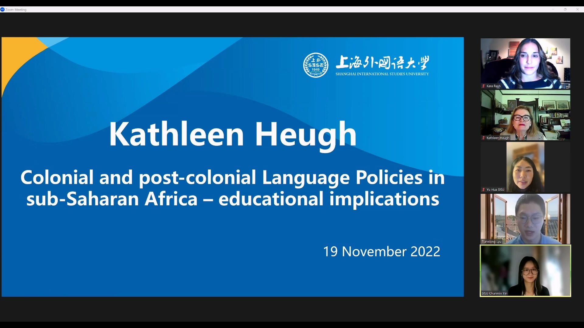 本次工作坊强调深度学术阅读与交流,由主讲人及作品介绍、主旨讲座、学术对谈和问答互动四个部分构成。中心的两位研究生尹春敏和吕天雄首先围绕Kathleen Heugh教授的学术经历和学术作品做了简要介绍,他们将教授关于该主题下的文献作品和自己的研究方向结合起来,对主讲人的研究做出了观点提炼,并就自己感兴趣的观点提出问题。爱荷华州立大学的两位学生代表Kara和Liu Mengyi也对Heugh教授在非洲所做的多语教育历史梳理和批判研究进行了介绍。Heugh教授对四位学生的引入介绍及思考表示感谢并给予赞许。