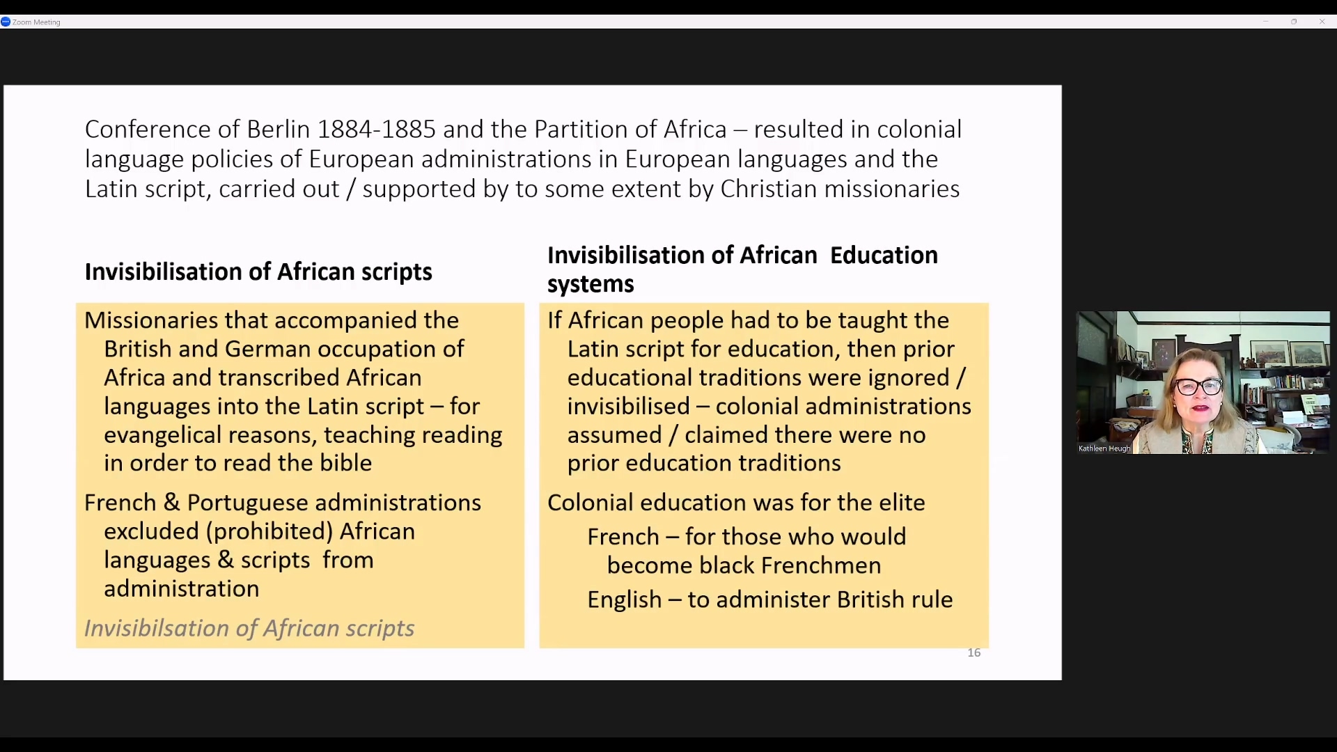 主题报告先从非洲古代的多语现象讲起,Kathleen教授基于历史文献梳理了非洲的语言文字发展变化历程。随后,Heugh教授简要介绍了殖民前非洲的语言教育政策。在对殖民前时期进行了简要探讨之后,将讨论主体转向对19世纪末至21世纪初撒哈拉以南非洲殖民和后殖民语言政策的概述,重点探讨了语言教育政策及其结果。最后,教授谈到语言教育政策研究对于双语和多语教育的影响,包括对当代主张和期望的批判性分析以及“跨语言”理论和教学法对于教学的作用。