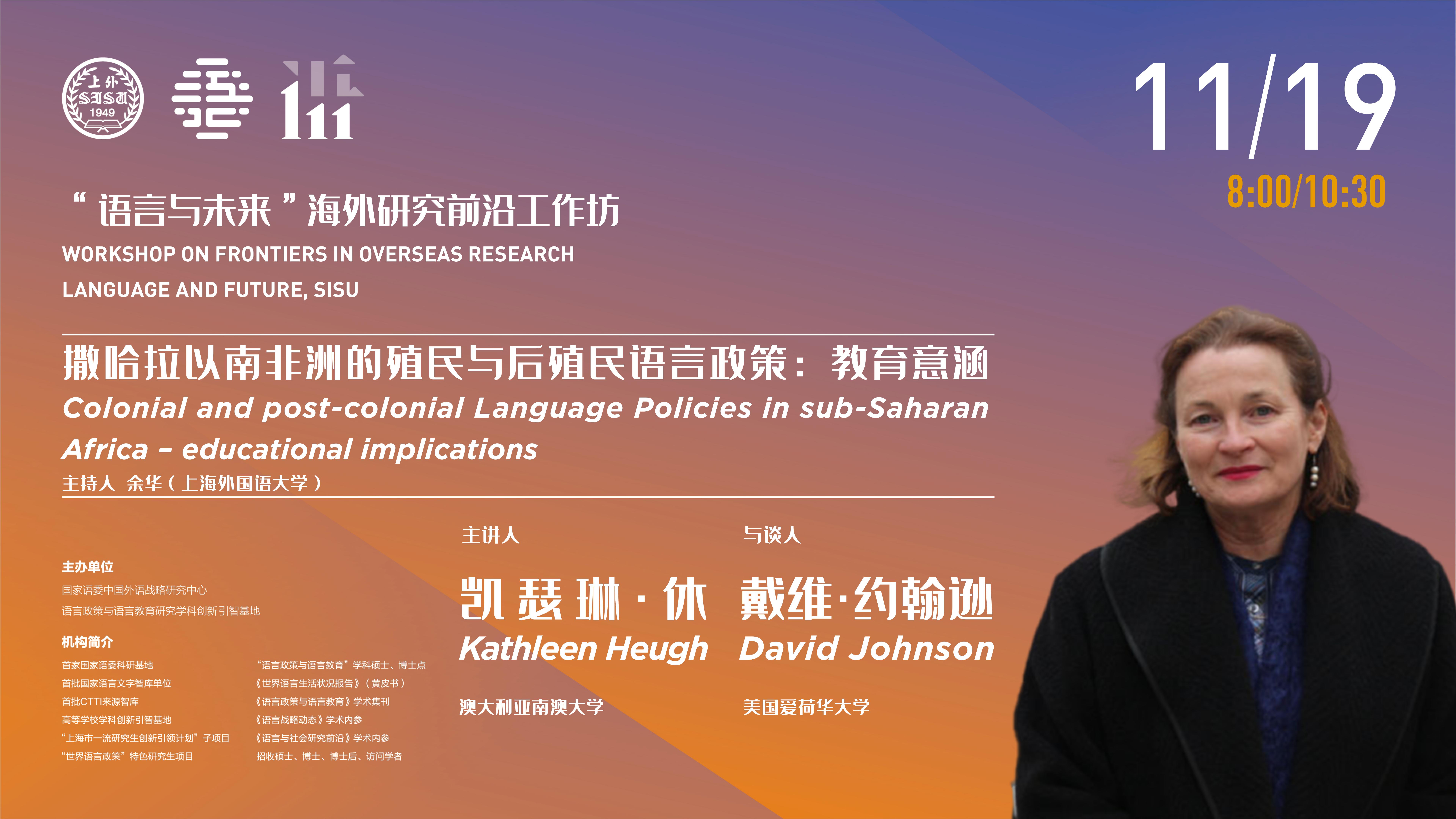 工作坊由中心副主任余华主持,澳大利亚南澳大学的Kathleen Heugh教授做题为《撒哈拉以南非洲的殖民与后殖民语言政策:教育意涵》的主题讲座,美国爱荷华大学David Johnson教授担任学术点评与访谈,上海外国语大学的三十多位师生、爱荷华州立大学的部分师生参与活动。